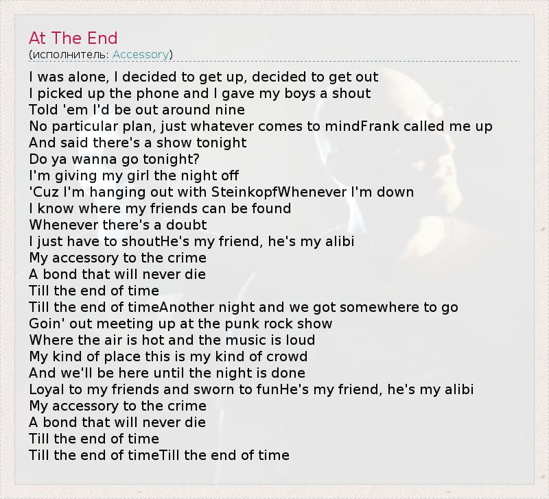 I was alone, I decided to get up, decided to get out I picked up the phone and I gave my boys a shout Told 'em I'd be out around nine No particular plan, just whatever comes to mindFrank called me up And said there's a show tonight Do ya wanna go tonight? I'm giving my girl the night off 'Cuz I'm hanging out with SteinkopfWhenever I'm down I know where my friends can be found Whenever there's a doubt I just have to shoutHe's my friend, he's my alibi My accessory to the crime A bond that will never die Till the end of time Till the end of timeAnother night and we got somewhere to go Goin' out meeting up at the punk rock show Where the air is hot and the music is loud My kind of place this is my kind of crowd And we'll be here until the night is done Loyal to my friends and sworn to funHe's my friend, he's my alibi My accessory to the crime A bond that will never die Till the end of time Till the end of timeTill the end of time