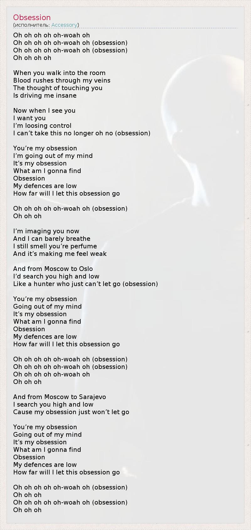 Oh oh oh oh oh-woah oh Oh oh oh oh oh-woah oh (obsession) Oh oh oh oh oh-woah oh (obsession) Oh oh oh oh When you walk into the room Blood rushes through my veins The thought of touching you Is driving me insane Now when I see you I want you I’m loosing control I can’t take this no longer oh no (obsession) You’re my obsession I’m going out of my mind It’s my obsession What am I gonna find Obsession My defences are low How far will I let this obsession go Oh oh oh oh oh-woah oh (obsession) Oh oh oh I’m imaging you now And I can barely breathe I still smell you’re perfume And it’s making me feel weak And from Moscow to Oslo I’d search you high and low Like a hunter who just can’t let go (obsession) You’re my obsession Going out of my mind It’s my obsession What am I gonna find Obsession My defences are low How far will I let this obsession go Oh oh oh oh oh-woah oh (obsession) Oh oh oh oh oh-woah oh (obsession) Oh oh oh oh oh-woah oh Oh oh oh And from Moscow to Sarajevo I search you high and low Cause my obsession just won’t let go You’re my obsession Going out of my mind It’s my obsession What am I gonna find Obsession My defences are low How far will I let this obsession go Oh oh oh oh oh-woah oh (obsession) Oh oh oh Oh oh oh oh oh-woah oh (obsession) Oh oh oh