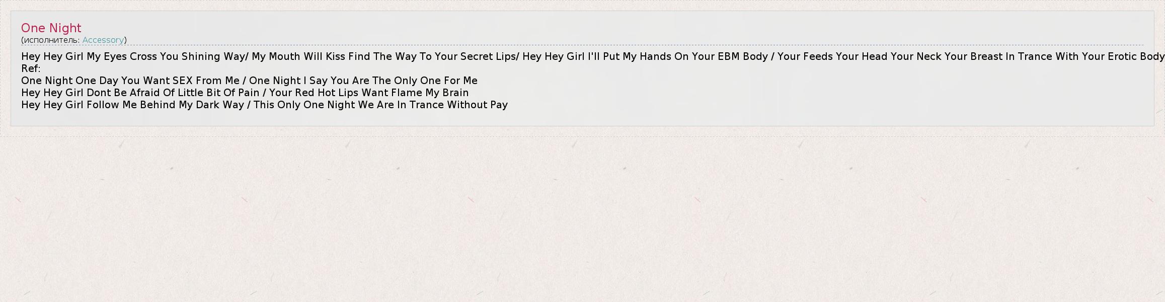 Hey Hey Girl My Eyes Cross You Shining Way/ My Mouth Will Kiss Find The Way To Your Secret Lips/ Hey Hey Girl I'll Put My Hands On Your EBM Body / Your Feeds Your Head Your Neck Your Breast In Trance With Your Erotic Body