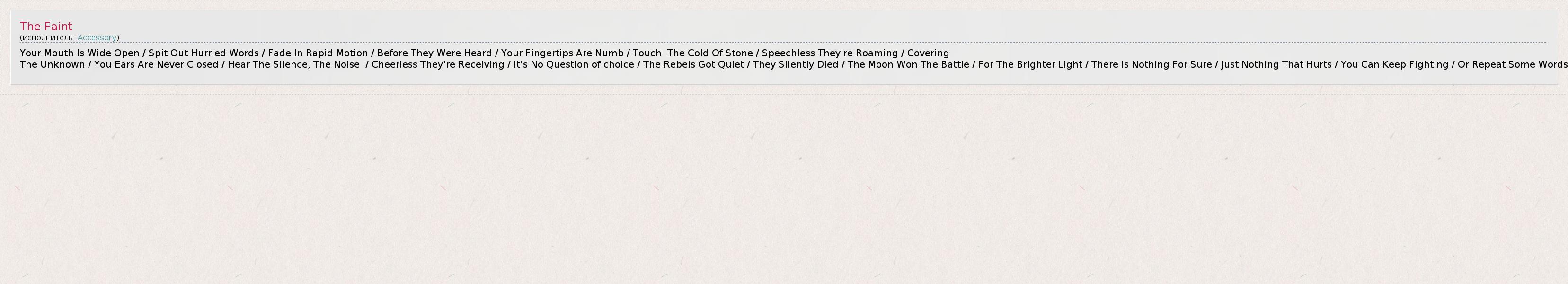 Your Mouth Is Wide Open / Spit Out Hurried Words / Fade In Rapid Motion / Before They Were Heard / Your Fingertips Are Numb / Touch  The Cold Of Stone / Speechless They're Roaming / Covering