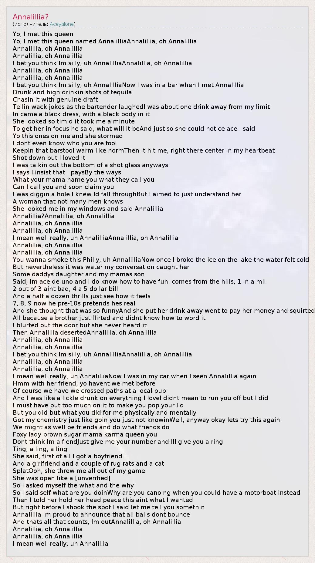 I bet you think Im silly, uh AnnalilliaNow I was in a bar when I met Annalillia