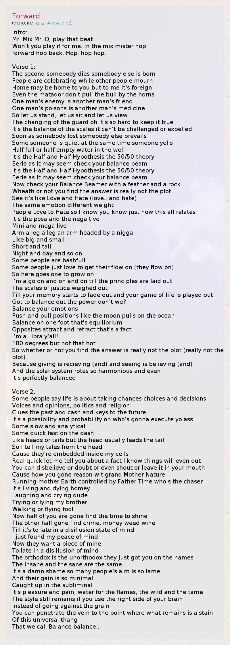 Это интересно:Известный и уважаемый МС, представитель Лос-Анджелесской андерграунд хип-хоп сцены. Свою карьеру МС начинал в составе группы Freestyle Fellowship, а в 1995 году выпустил свой первый сольный альбом All Balls Don't Bounce. Чем занимается и по сей день - весной 2009 года вышел его девятый альбом - Aceyalone & The Lonely Ones. Aceyalone продолжает экспериментировать со стилями - если его предыдущий альбом Lighting Strikes представлял... продолжение