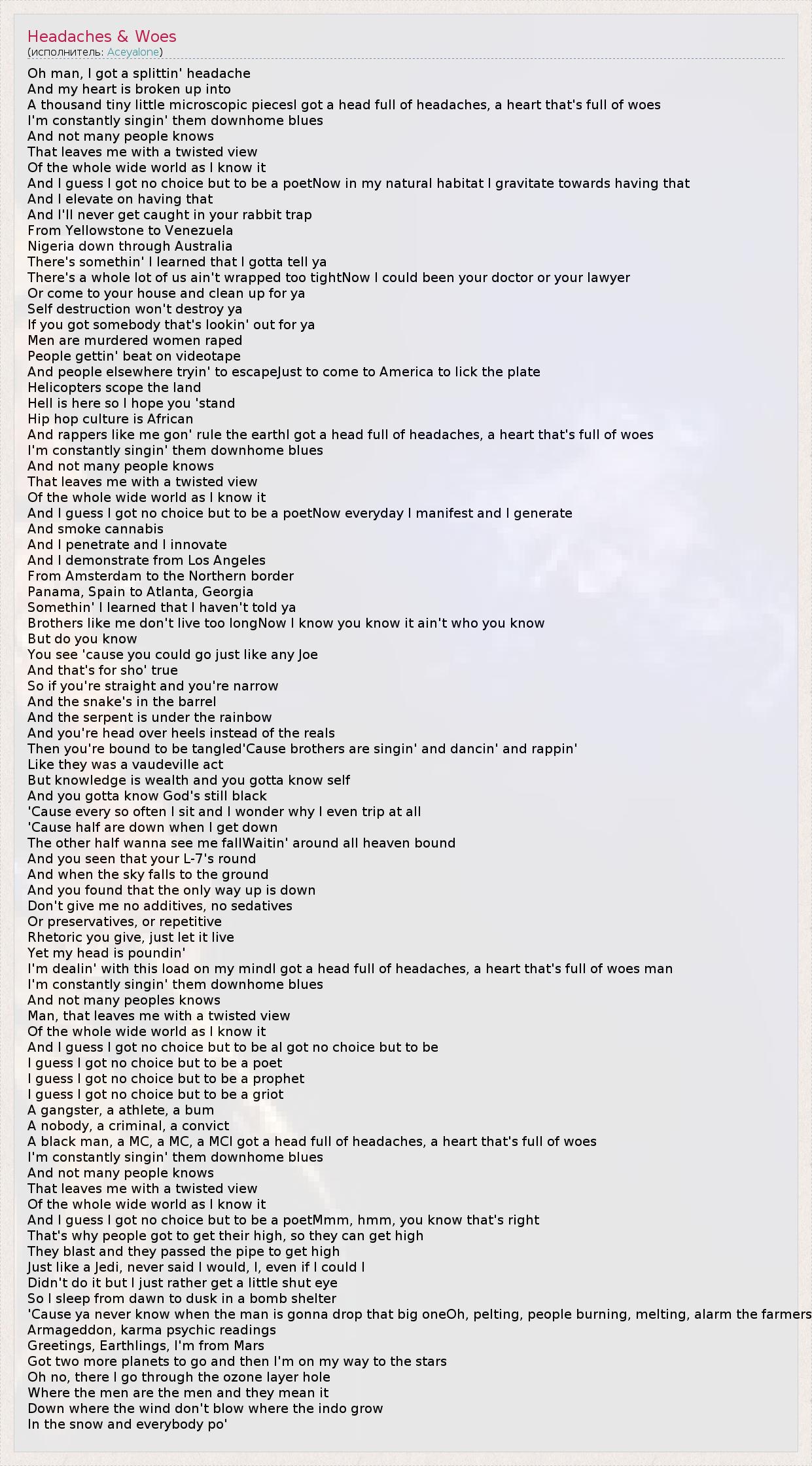 А как ты думаешь, о чем песня "Headaches & Woes" ?