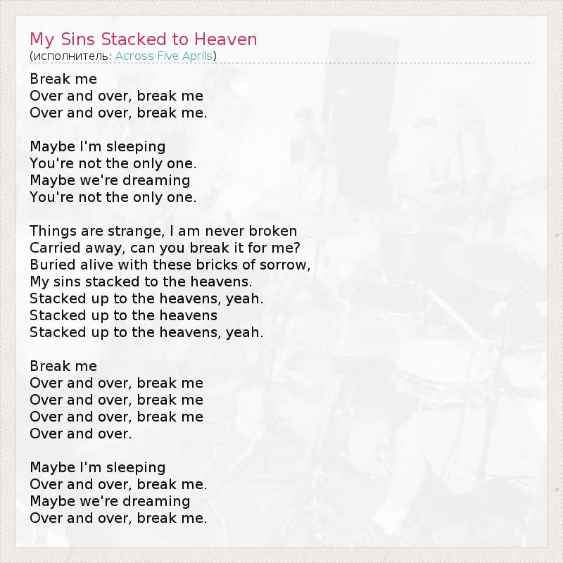 Break me Over and over, break me Over and over, break me. Maybe I'm sleeping You're not the only one. Maybe we're dreaming You're not the only one. Things are strange, I am never broken Carried away, can you break it for me? Buried alive with these bricks of sorrow, My sins stacked to the heavens. Stacked up to the heavens, yeah. Stacked up to the heavens Stacked up to the heavens, yeah. Break me Over and over, break me Over and over, break me Over and over, break me Over and over. Maybe I'm sleeping Over and over, break me. Maybe we're dreaming Over and over, break me.