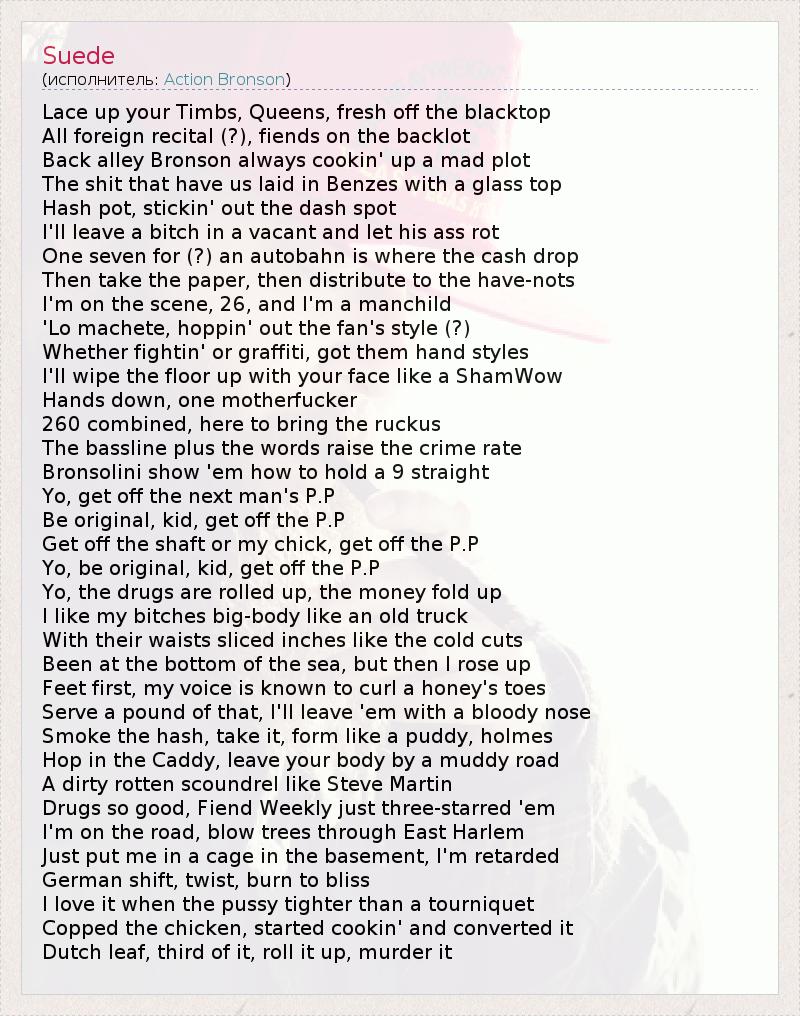 Lace up your Timbs, Queens, fresh off the blacktop All foreign recital (?), fiends on the backlot Back alley Bronson always cookin' up a mad plot The shit that have us laid in Benzes with a glass top Hash pot, stickin' out the dash spot I'll leave a bitch in a vacant and let his ass rot One seven for (?) an autobahn is where the cash drop Then take the paper, then distribute to the have-nots I'm on the scene, 26, and I'm a manchild 'Lo machete, hoppin' out the fan's style (?) Whether fightin' or graffiti, got them hand styles I'll wipe the floor up with your face like a ShamWow Hands down, one motherfucker 260 combined, here to bring the ruckus The bassline plus the words raise the crime rate Bronsolini show 'em how to hold a 9 straight Yo, get off the next man's P.P Be original, kid, get off the P.P Get off the shaft or my chick, get off the P.P Yo, be original, kid, get off the P.P Yo, the drugs are rolled up, the money fold up I like my bitches big-body like an old truck With their waists sliced inches like the cold cuts Been at the bottom of the sea, but then I rose up Feet first, my voice is known to curl a honey's toes Serve a pound of that, I'll leave 'em with a bloody nose Smoke the hash, take it, form like a puddy, holmes Hop in the Caddy, leave your body by a muddy road A dirty rotten scoundrel like Steve Martin Drugs so good, Fiend Weekly just three-starred 'em I'm on the road, blow trees through East Harlem Just put me in a cage in the basement, I'm retarded German shift, twist, burn to bliss I love it when the pussy tighter than a tourniquet Copped the chicken, started cookin' and converted it Dutch leaf, third of it, roll it up, murder it