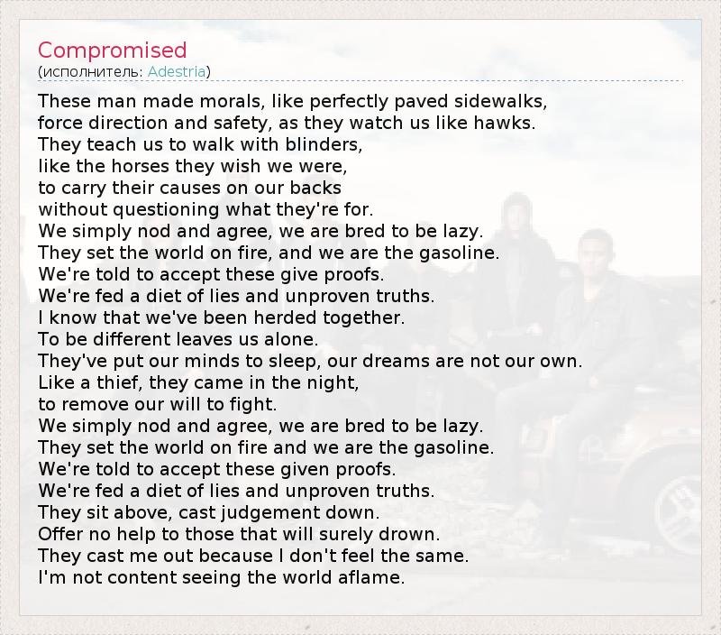 Это человек сделал мораль , как прекрасно асфальтированных тротуаров , Направление силы и безопасность , так как они наблюдают за нами как ястребы . Они учат нас ходить с шоры , как лошадей , которые они желают мы были , чтобы нести их причины на наших спинах не подвергая сомнению то, что они. Мы просто кивнуть и согласится, мы разводят лениться . Они установили мир в огне , и мыбензин . Нам говорят, чтобы принять это дает доказательства. Мы кормили лжи и недоказанных истин. Я знаю, что мы были согнаны вместе. Чтобы отличаться оставляет нас в покое. Они вложили наши умы, чтобы спать , наши мечты не принадлежим себе . Как вор , они пришли в ночное время, удалить нашу волю к борьбе . Мы просто кивнуть и согласится, мы разводят лениться . Они установили мир в огне , и мыбензин . Нам говорят, чтобы принять эти данные доказательства. Мы кормили лжи и недоказанных истин. Они сидят выше, бросил суждение вниз . Предложение никакой помощи тем, которые, несомненно, утонуть. Они бросили меня, потому что я не чувствую то же самое. Я не довольствоваться видеть мир в огне .