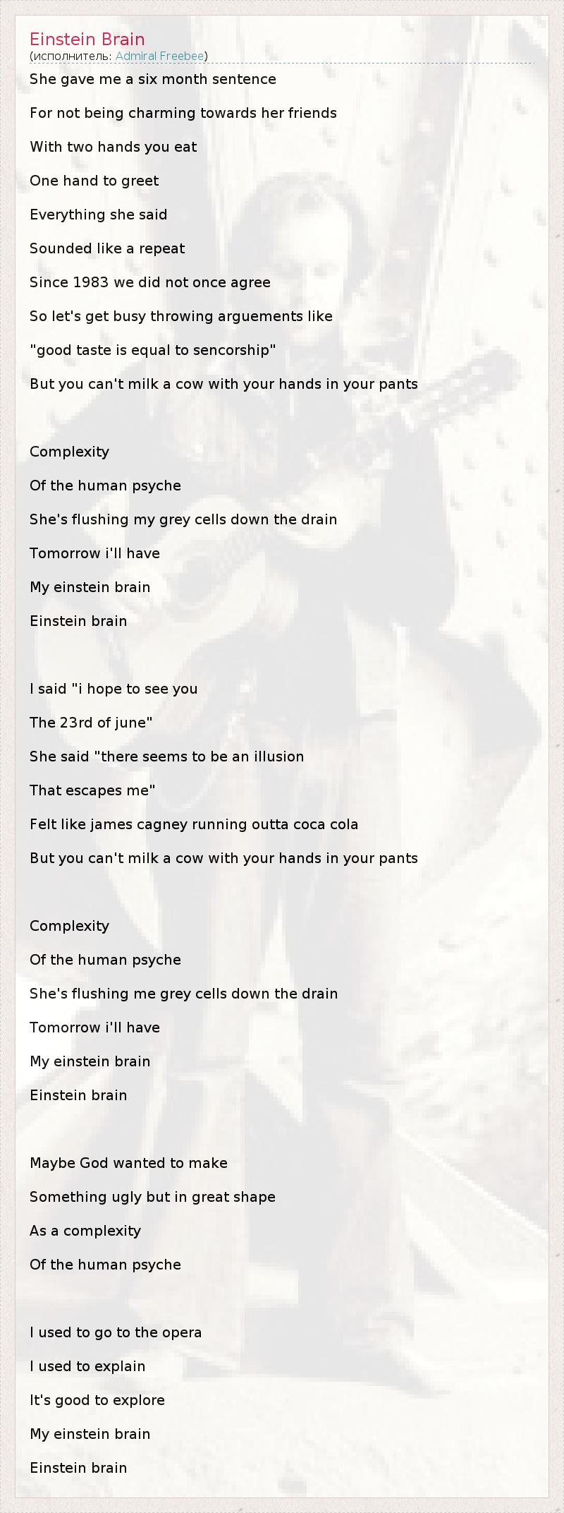 She gave me a six month sentence For not being charming towards her friends With two hands you eat One hand to greet Everything she said Sounded like a repeat Since 1983 we did not once agree So let's get busy throwing arguements like "good taste is equal to sencorship" But you can't milk a cow with your hands in your pants Complexity Of the human psyche She's flushing my grey cells down the drain Tomorrow i'll have My einstein brain Einstein brain I said "i hope to see you The 23rd of june" She said "there seems to be an illusion That escapes me" Felt like james cagney running outta coca cola But you can't milk a cow with your hands in your pants Complexity Of the human psyche She's flushing me grey cells down the drain Tomorrow i'll have My einstein brain Einstein brain Maybe God wanted to make Something ugly but in great shape As a complexity Of the human psyche I used to go to the opera I used to explain It's good to explore My einstein brain Einstein brain