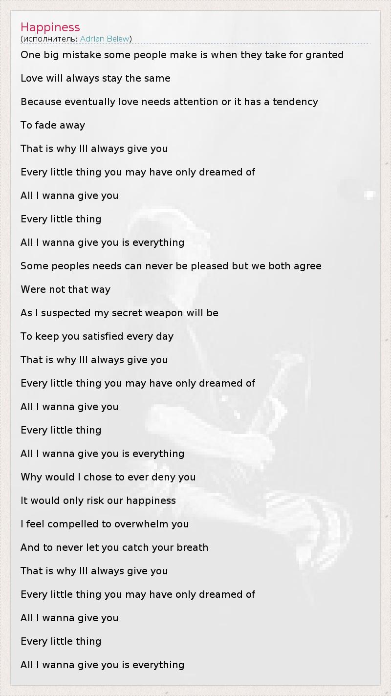 One big mistake some people make is when they take for granted Love will always stay the same Because eventually love needs attention or it has a tendency To fade away That is why Ill always give you Every little thing you may have only dreamed of All I wanna give you Every little thing All I wanna give you is everything Some peoples needs can never be pleased but we both agree Were not that way As I suspected my secret weapon will be To keep you satisfied every day That is why Ill always give you Every little thing you may have only dreamed of All I wanna give you Every little thing All I wanna give you is everything Why would I chose to ever deny you It would only risk our happiness I feel compelled to overwhelm you And to never let you catch your breath That is why Ill always give you Every little thing you may have only dreamed of All I wanna give you Every little thing All I wanna give you is everything