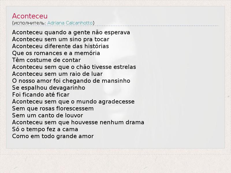 Aconteceu QuandoGente não esperava Aconteceu сем мкм китайско пра tocar Aconteceu diferente дас Historias Que OS романсы д а Memoria Tem костюм де CONTAR Aconteceu сем Que о Чао tivesse Estrelas Aconteceu сем мкм RAIO де Луар О свободе информации Nosso Amor chegando де mansinho Се espalhou devagarinho Foi ficando até Ficar Aconteceu сем Que о Mundo agradecesse Семь Que Росас florescessem Семь мкм песнь де louvor Aconteceu сем Que houvesse Nenhum драма Só о темп СЭЗ в Кама Комо EM TODO Grande Amor