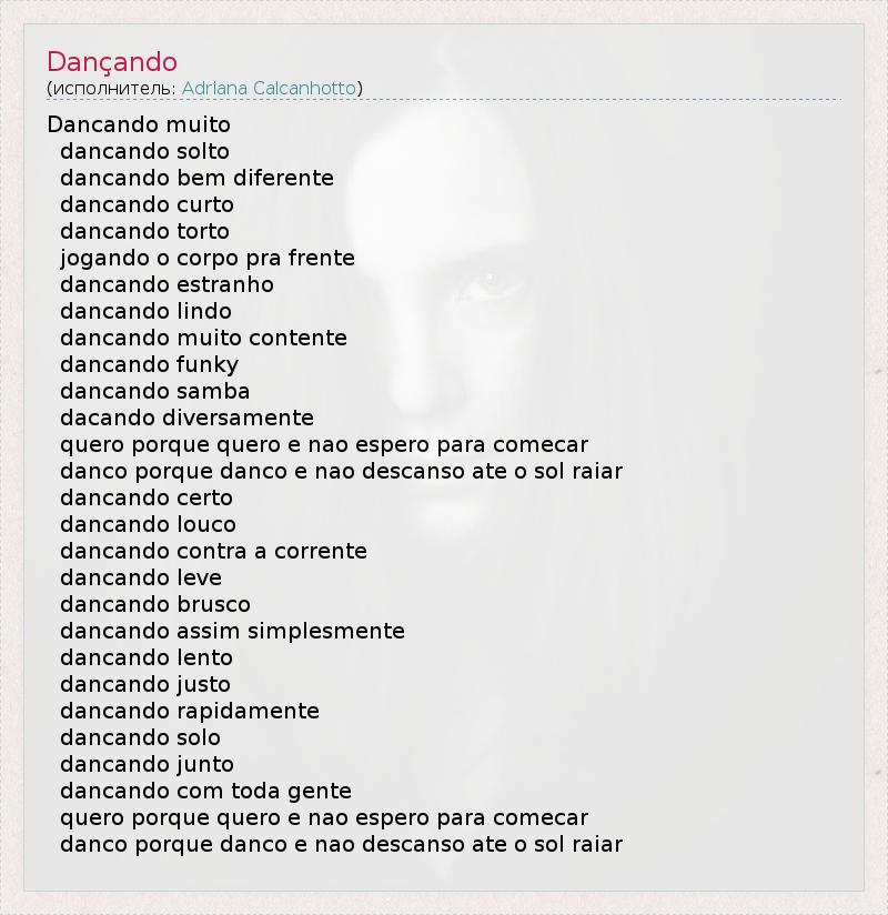 Это интересно:Adriana Calcanhotto (ранее Calcanhoto) - певица и композитор в жанре MPB (Music Popular Brazileiro - бразильская популярная музыка), проявила себя в 1990 году, который стал для нее началом большого успеха и помог вновь привлечь музыку Бразилии в мировые хит-парады. На рубеже нового тысячелетия Адриана пережила взлет своей карьеры, который продолжается и по сей день.Дискография:Enguiço (1990)Senhas (1992)A Fábrica do Poema... продолжение