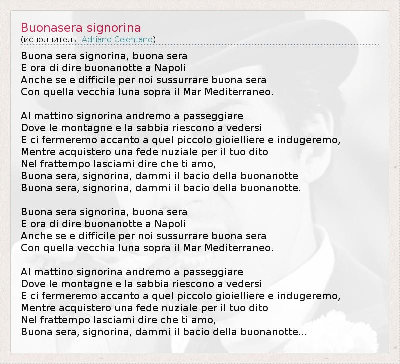 Добрый вечер, синьорина, добрый вечер. Пожелаем Неаполю спокойного сна, Хоть это и трудно, прошепчем «добрый вечер» Со старой луной над Средиземным морем. Утром мы отправимся на прогулку, синьорина, И посмотрим на горы и песок. Остановимся около того маленького ювелирного магазинчика И помедлим, пока я буду подбирать обручальное кольцо для твоего пальчика, И в тот же момент позволь мне сказать, что я тебя люблю. Добрый вечер, синьорина, подари мне поцелуй перед сном, Добрый вечер, синьорина, подари мне поцелуй перед сном... Добрый вечер, синьорина, добрый вечер. Пожелаем Неаполю спокойного сна, Хоть это и трудно, прошепчем «добрый вечер» Со старой луной над Средиземным морем. Утром мы отправимся на прогулку, синьорина, И посмотрим на горы и песок. Остановимся около того маленького ювелирного магазинчика И помедлим, пока я буду подбирать обручальное кольцо для твоего пальчика, И в тот же момент позволь мне сказать, что я тебя люблю. Добрый вечер, синьорина, подари мне поцелуй перед сном...