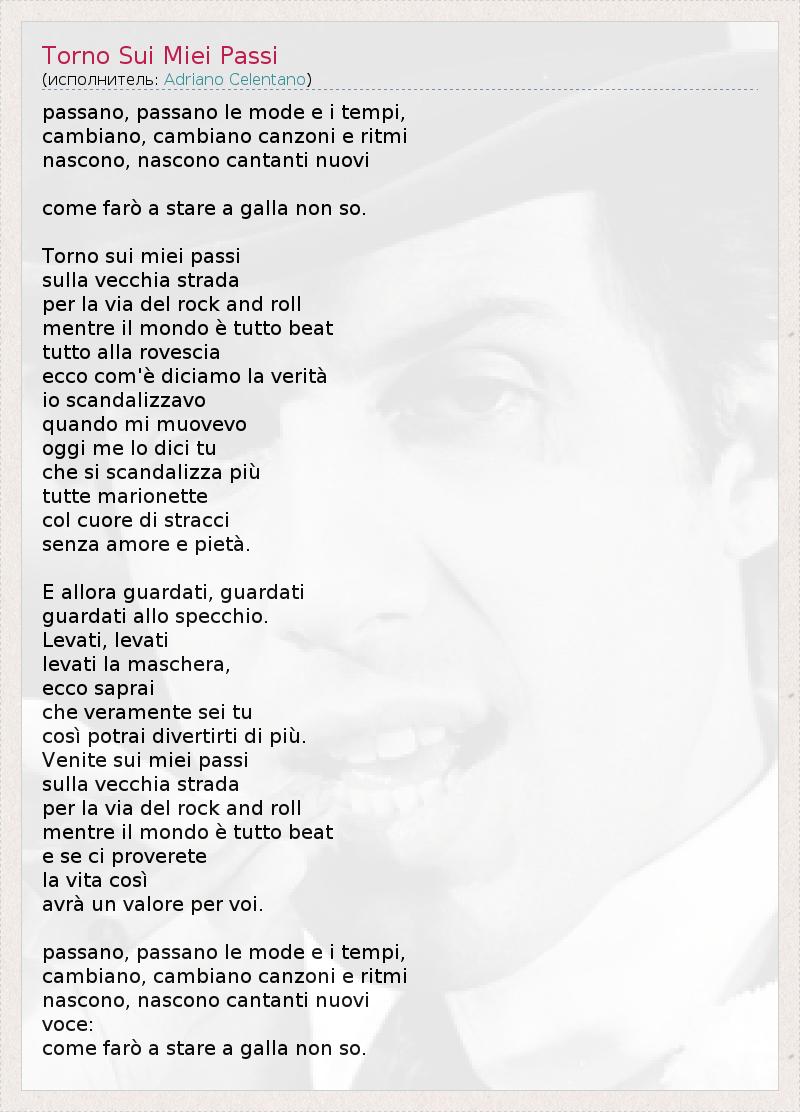 Пассано , Пассано ле режим E I темпов , Cambiano , Cambiano Canzoni е Ritmi nascono , nascono cantanti Nuovi прийти Фаро взглядом на Galla , не так . Torno Sui Miei Пасси Сулла Vecchia Страда за ла через дель рок -н-ролл mentre Il Mondo Поблагодарили Tutto бить Tutto алла rovescia ECCO com'è diciamo ла verità Ио scandalizzavo Quando миль muovevo OGGI меня вот ДИКИ ту че си scandalizza più Так поступают все марионетка цв Cuore ди stracci Senza напиток е pietà . E Allora Guardati , Guardati Guardati алло Specchio . Levati , levati levati ла -маскарад , ECCO saprai че Veramente сеи ту così potrai divertirti ди ГРП. Venite Sui Miei Пасси Сулла Vecchia Страда за ла через дель рок -н-ролл mentre Il Mondo Поблагодарили Tutto бить E SE CI proverete La Vita così AVRA ООН Valore за ВОИ . Пассано , Пассано ле режим E I темпов , Cambiano , Cambiano Canzoni е Ritmi nascono , nascono cantanti Nuovi Voce : прийти Фаро взглядом на Galla , не так .