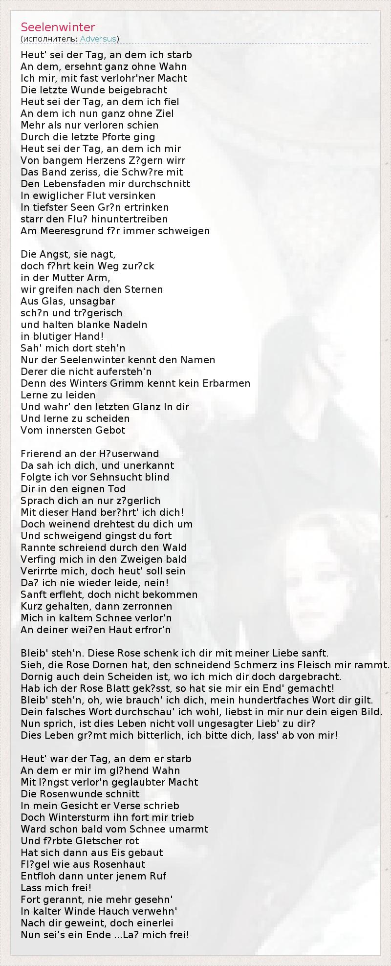 Heut' sei der Tag, an dem ich starb An dem, ersehnt ganz ohne Wahn Ich mir, mit fast verlohr'ner Macht Die letzte Wunde beigebracht Heut sei der Tag, an dem ich fiel An dem ich nun ganz ohne Ziel Mehr als nur verloren schien Durch die letzte Pforte ging Heut sei der Tag, an dem ich mir Von bangem Herzens Z?gern wirr Das Band zeriss, die Schw?re mit Den Lebensfaden mir durchschnitt In ewiglicher Flut versinken In tiefster Seen Gr?n ertrinken starr den Flu? hinuntertreiben Am Meeresgrund f?r immer schweigen Die Angst, sie nagt, doch f?hrt kein Weg zur?ck in der Mutter Arm, wir greifen nach den Sternen Aus Glas, unsagbar sch?n und tr?gerisch und halten blanke Nadeln in blutiger Hand! Sah' mich dort steh'n Nur der Seelenwinter kennt den Namen Derer die nicht aufersteh'n Denn des Winters Grimm kennt kein Erbarmen Lerne zu leiden Und wahr' den letzten Glanz In dir Und lerne zu scheiden Vom innersten Gebot Frierend an der H?userwand Da sah ich dich, und unerkannt Folgte ich vor Sehnsucht blind Dir in den eignen Tod Sprach dich an nur z?gerlich Mit dieser Hand ber?hrt' ich dich! Doch weinend drehtest du dich um Und schweigend gingst du fort Rannte schreiend durch den Wald Verfing mich in den Zweigen bald Verirrte mich, doch heut' soll sein Da? ich nie wieder leide, nein! Sanft erfleht, doch nicht bekommen Kurz gehalten, dann zerronnen Mich in kaltem Schnee verlor'n An deiner wei?en Haut erfror'n Bleib' steh'n. Diese Rose schenk ich dir mit meiner Liebe sanft. Sieh, die Rose Dornen hat, den schneidend Schmerz ins Fleisch mir rammt. Dornig auch dein Scheiden ist, wo ich mich dir doch dargebracht. Hab ich der Rose Blatt gek?sst, so hat sie mir ein End' gemacht! Bleib' steh'n, oh, wie brauch' ich dich, mein hundertfaches Wort dir gilt. Dein falsches Wort durchschau' ich wohl, liebst in mir nur dein eigen Bild. Nun sprich, ist dies Leben nicht voll ungesagter Lieb' zu dir? Dies Leben gr?mt mich bitterlich, ich bitte dich, lass' ab von mir! Heut' war der Tag, an dem er starb An dem er mir im gl?hend Wahn Mit l?ngst verlor'n geglaubter Macht Die Rosenwunde schnitt In mein Gesicht er Verse schrieb Doch Wintersturm ihn fort mir trieb Ward schon bald vom Schnee umarmt Und f?rbte Gletscher rot Hat sich dann aus Eis gebaut Fl?gel wie aus Rosenhaut Entfloh dann unter jenem Ruf Lass mich frei! Fort gerannt, nie mehr gesehn' In kalter Winde Hauch verwehn' Nach dir geweint, doch einerlei Nun sei's ein Ende ...La? mich frei!