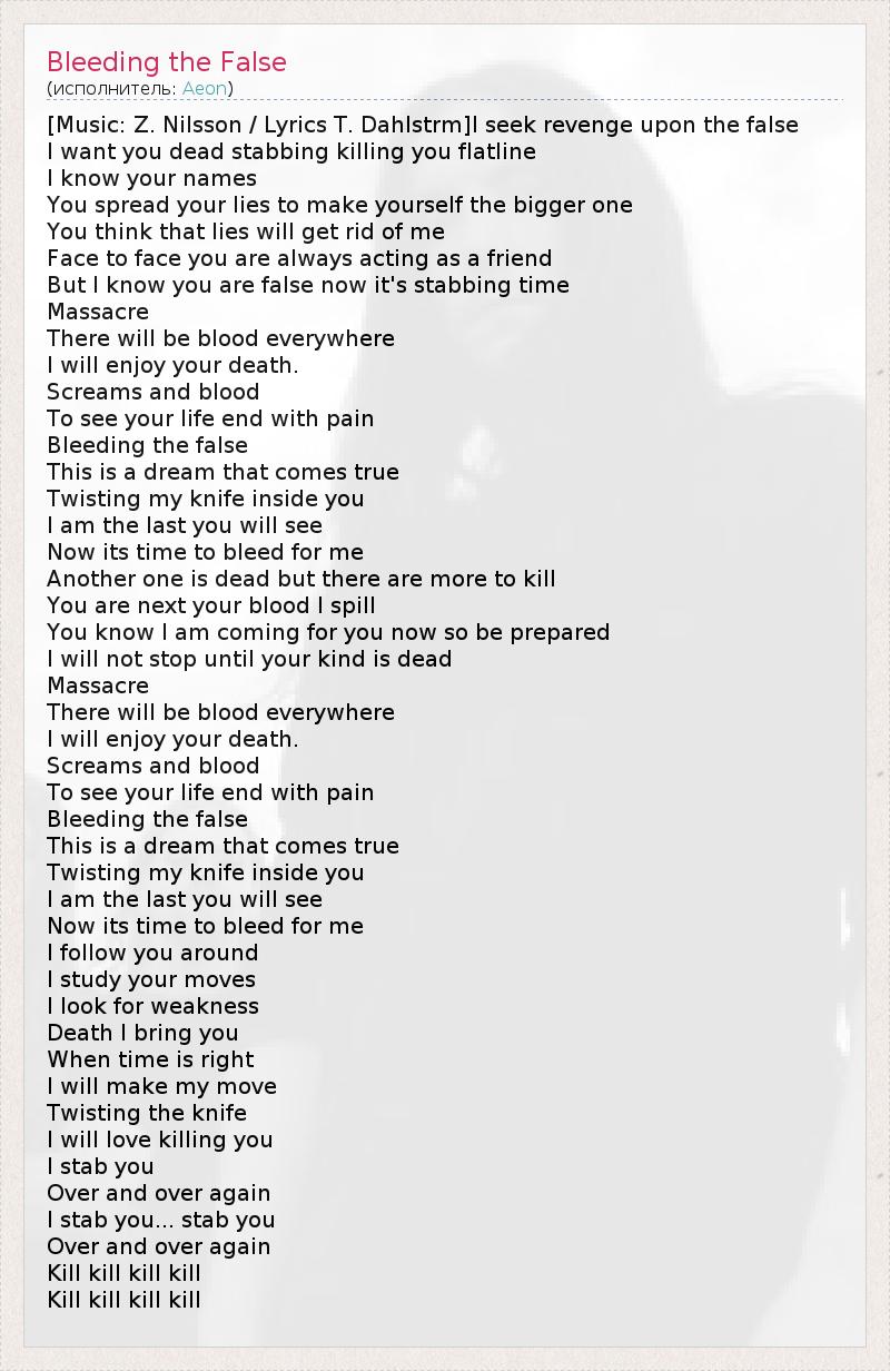 [Music: Z. Nilsson / Lyrics T. Dahlstrm]I seek revenge upon the false I want you dead stabbing killing you flatline I know your names You spread your lies to make yourself the bigger one You think that lies will get rid of me Face to face you are always acting as a friend But I know you are false now it's stabbing time Massacre There will be blood everywhere I will enjoy your death. Screams and blood To see your life end with pain Bleeding the false This is a dream that comes true Twisting my knife inside you I am the last you will see Now its time to bleed for me Another one is dead but there are more to kill You are next your blood I spill You know I am coming for you now so be prepared I will not stop until your kind is dead Massacre There will be blood everywhere I will enjoy your death. Screams and blood To see your life end with pain Bleeding the false This is a dream that comes true Twisting my knife inside you I am the last you will see Now its time to bleed for me I follow you around I study your moves I look for weakness Death I bring you When time is right I will make my move Twisting the knife I will love killing you I stab you Over and over again I stab you... stab you Over and over again Kill kill kill kill Kill kill kill kill