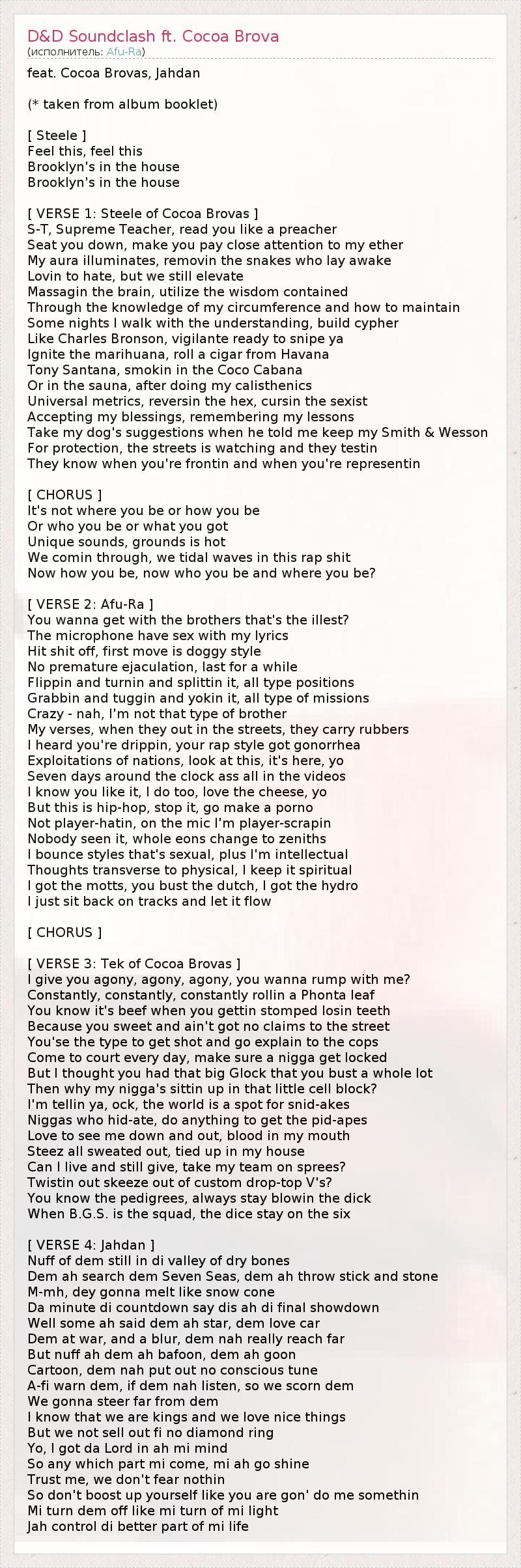 А как ты думаешь, о чем песня "D&D Soundclash ft. Cocoa Brova" ?