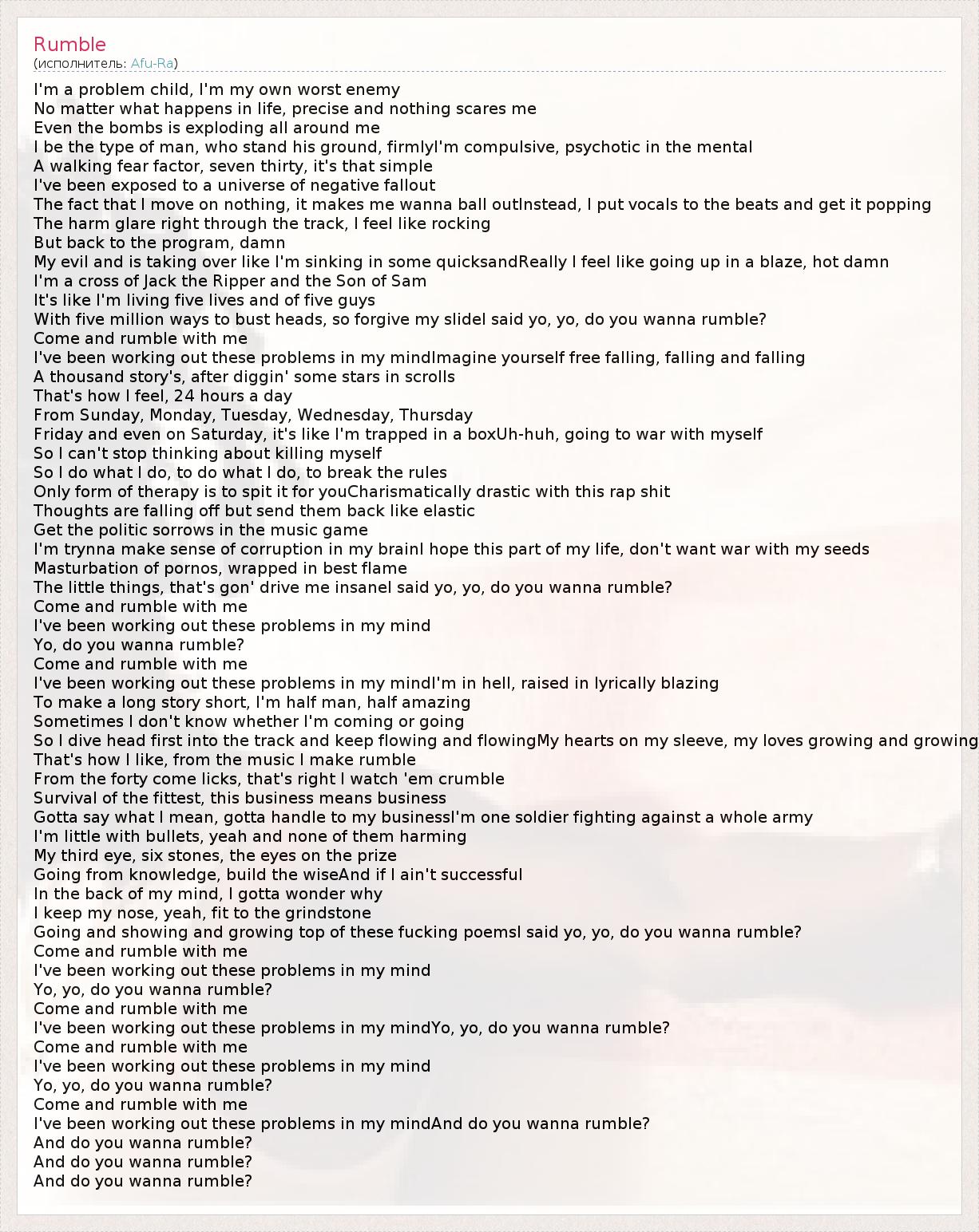 I'm a problem child, I'm my own worst enemy No matter what happens in life, precise and nothing scares me Even the bombs is exploding all around me I be the type of man, who stand his ground, firmlyI'm compulsive, psychotic in the mental A walking fear factor, seven thirty, it's that simple I've been exposed to a universe of negative fallout The fact that I move on nothing, it makes me wanna ball outInstead, I put vocals to the beats and get it popping The harm glare right through the track, I feel like rocking But back to the program, damn My evil and is taking over like I'm sinking in some quicksandReally I feel like going up in a blaze, hot damn I'm a cross of Jack the Ripper and the Son of Sam It's like I'm living five lives and of five guys With five million ways to bust heads, so forgive my slideI said yo, yo, do you wanna rumble? Come and rumble with me I've been working out these problems in my mindImagine yourself free falling, falling and falling A thousand story's, after diggin' some stars in scrolls That's how I feel, 24 hours a day From Sunday, Monday, Tuesday, Wednesday, Thursday Friday and even on Saturday, it's like I'm trapped in a boxUh-huh, going to war with myself So I can't stop thinking about killing myself So I do what I do, to do what I do, to break the rules Only form of therapy is to spit it for youCharismatically drastic with this rap shit Thoughts are falling off but send them back like elastic Get the politic sorrows in the music game I'm trynna make sense of corruption in my brainI hope this part of my life, don't want war with my seeds Masturbation of pornos, wrapped in best flame The little things, that's gon' drive me insaneI said yo, yo, do you wanna rumble? Come and rumble with me I've been working out these problems in my mind Yo, do you wanna rumble? Come and rumble with me I've been working out these problems in my mindI'm in hell, raised in lyrically blazing To make a long story short, I'm half man, half amazing Sometimes I don't know whether I'm coming or going So I dive head first into the track and keep flowing and flowingMy hearts on my sleeve, my loves growing and growing That's how I like, from the music I make rumble From the forty come licks, that's right I watch 'em crumble Survival of the fittest, this business means business Gotta say what I mean, gotta handle to my businessI'm one soldier fighting against a whole army I'm little with bullets, yeah and none of them harming My third eye, six stones, the eyes on the prize Going from knowledge, build the wiseAnd if I ain't successful In the back of my mind, I gotta wonder why I keep my nose, yeah, fit to the grindstone Going and showing and growing top of these fucking poemsI said yo, yo, do you wanna rumble? Come and rumble with me I've been working out these problems in my mind Yo, yo, do you wanna rumble? Come and rumble with me I've been working out these problems in my mindYo, yo, do you wanna rumble? Come and rumble with me I've been working out these problems in my mind Yo, yo, do you wanna rumble? Come and rumble with me I've been working out these problems in my mindAnd do you wanna rumble? And do you wanna rumble? And do you wanna rumble? And do you wanna rumble?