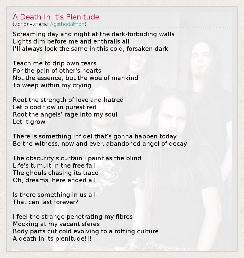День и ночь кричат в темных запретных стенах. Свет меркнет предо мной и поглощает все. Я вечно одинаков в холодной, покинутой тьме... Научи меня ронять капли собственных слез За боль других сердец, Чтобы не сущность, Но скорбь человечества Проливалась в слезах моих рыданий. Источник силы любви и ненависти Пусть кровь течет чистейшим красным цветом, Пускает корни ангельской ярости в мою душу. Пусть она растет... Что-то безбожное должно случиться сегодня. Будь свидетелем, ныне и на века, покинутый ангел разрушения. Словно слепой я рисую завесу тьмы, Смятение жизни в свободном падении, Вурдалаки мчаться по ее следу. О, сны, здесь закончилось все... Есть ли во всех нас что-либо, Что будет длиться вечно? Я чувствую нечто странное, пронзающее мою плоть, Насмехающееся над моими пустыми сферами. Части тела режут холод, развиваясь в гниющую культуру. Смерть в своем расцвете!