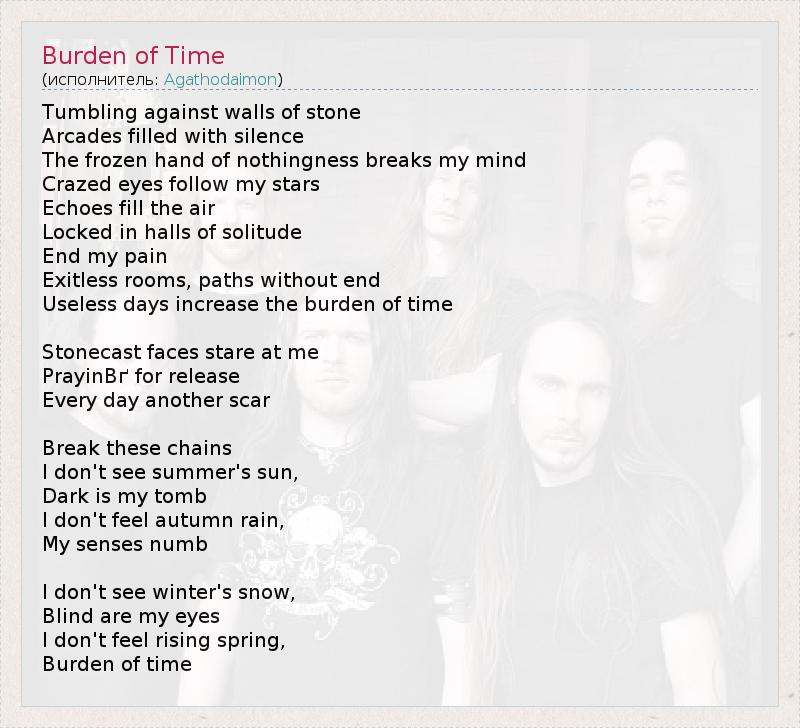 Бросаюсь на стены камней Аркады полны тишиной Холодная рука небытия разрушает разум мой Безумные глаза следят за моими звездами Эха наполняют воздух Я заперт в зале одиночества Прекрати мою боль Комнаты без выхода, тропинки без конца Бесполезные дни увеличивают бремя времени Каменные лики смотрят на меня Молясь об освобождении Каждый день еще один шрам Разорви эту цепь Я не вижу солнца лета, моя могила тьма Не ощущаю дождь осенний, мои чувства онемели Я не вижу снег зимы, слепы мои глаза Я не чувствую весны, бремя времени