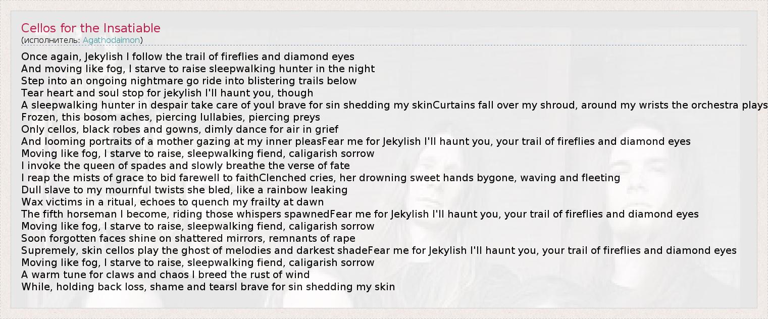 ГлавнаяИсполнителиAgathodaimonCellos for the Insatiable