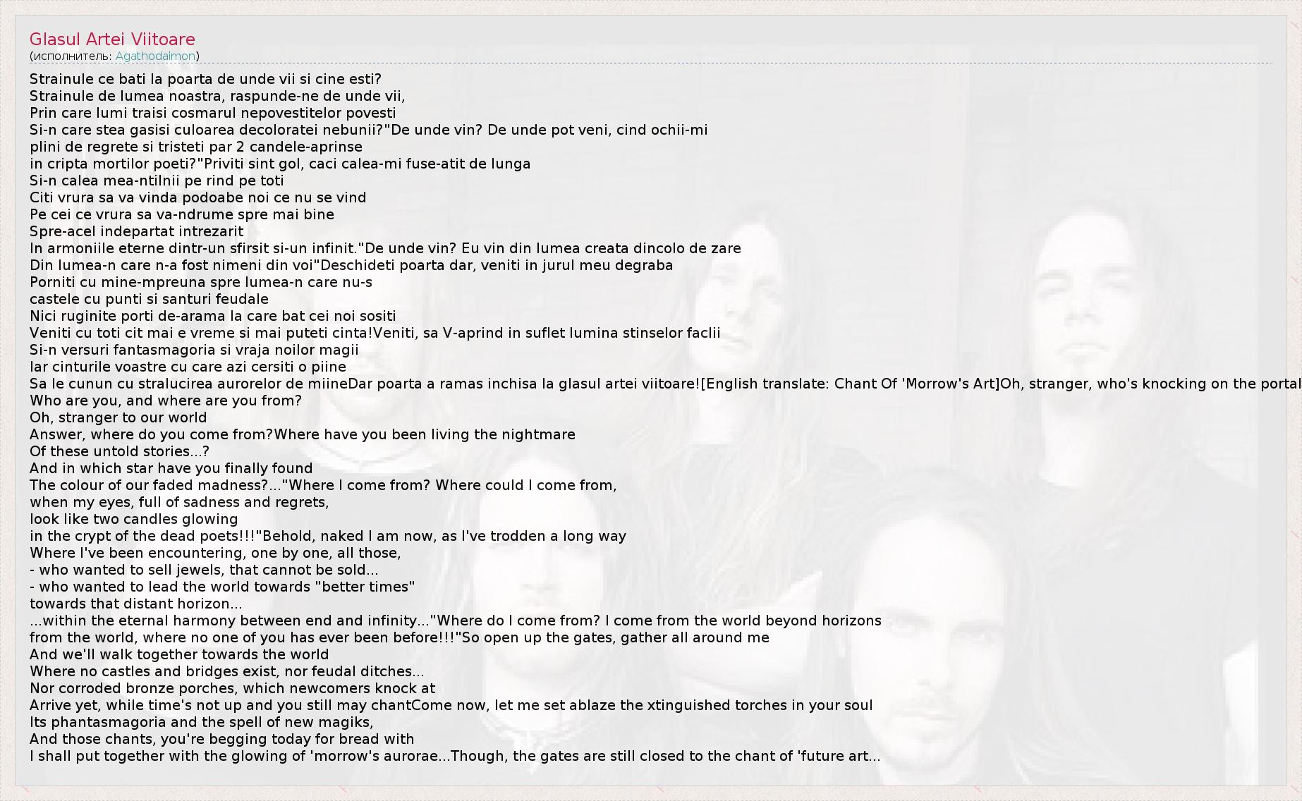 Strainule ce bati la poarta de unde vii si cine esti? Strainule de lumea noastra, raspunde-ne de unde vii, Prin care lumi traisi cosmarul nepovestitelor povesti Si-n care stea gasisi culoarea decoloratei nebunii?"De unde vin? De unde pot veni, cind ochii-mi plini de regrete si tristeti par 2 candele-aprinse in cripta mortilor poeti?"Priviti sint gol, caci calea-mi fuse-atit de lunga Si-n calea mea-ntilnii pe rind pe toti Citi vrura sa va vinda podoabe noi ce nu se vind Pe cei ce vrura sa va-ndrume spre mai bine Spre-acel indepartat intrezarit In armoniile eterne dintr-un sfirsit si-un infinit."De unde vin? Eu vin din lumea creata dincolo de zare Din lumea-n care n-a fost nimeni din voi"Deschideti poarta dar, veniti in jurul meu degraba Porniti cu mine-mpreuna spre lumea-n care nu-s castele cu punti si santuri feudale Nici ruginite porti de-arama la care bat cei noi sositi Veniti cu toti cit mai e vreme si mai puteti cinta!Veniti, sa V-aprind in suflet lumina stinselor faclii Si-n versuri fantasmagoria si vraja noilor magii Iar cinturile voastre cu care azi cersiti o piine Sa le cunun cu stralucirea aurorelor de miineDar poarta a ramas inchisa la glasul artei viitoare![English translate: Chant Of 'Morrow's Art]Oh, stranger, who's knocking on the portal Who are you, and where are you from? Oh, stranger to our world Answer, where do you come from?Where have you been living the nightmare Of these untold stories...? And in which star have you finally found The colour of our faded madness?..."Where I come from? Where could I come from, when my eyes, full of sadness and regrets, look like two candles glowing in the crypt of the dead poets!!!"Behold, naked I am now, as I've trodden a long way Where I've been encountering, one by one, all those, - who wanted to sell jewels, that cannot be sold... - who wanted to lead the world towards "better times" towards that distant horizon... ...within the eternal harmony between end and infinity..."Where do I come from? I come from the world beyond horizons from the world, where no one of you has ever been before!!!"So open up the gates, gather all around me And we'll walk together towards the world Where no castles and bridges exist, nor feudal ditches... Nor corroded bronze porches, which newcomers knock at Arrive yet, while time's not up and you still may chantCome now, let me set ablaze the xtinguished torches in your soul Its phantasmagoria and the spell of new magiks, And those chants, you're begging today for bread with I shall put together with the glowing of 'morrow's aurorae...Though, the gates are still closed to the chant of 'future art...