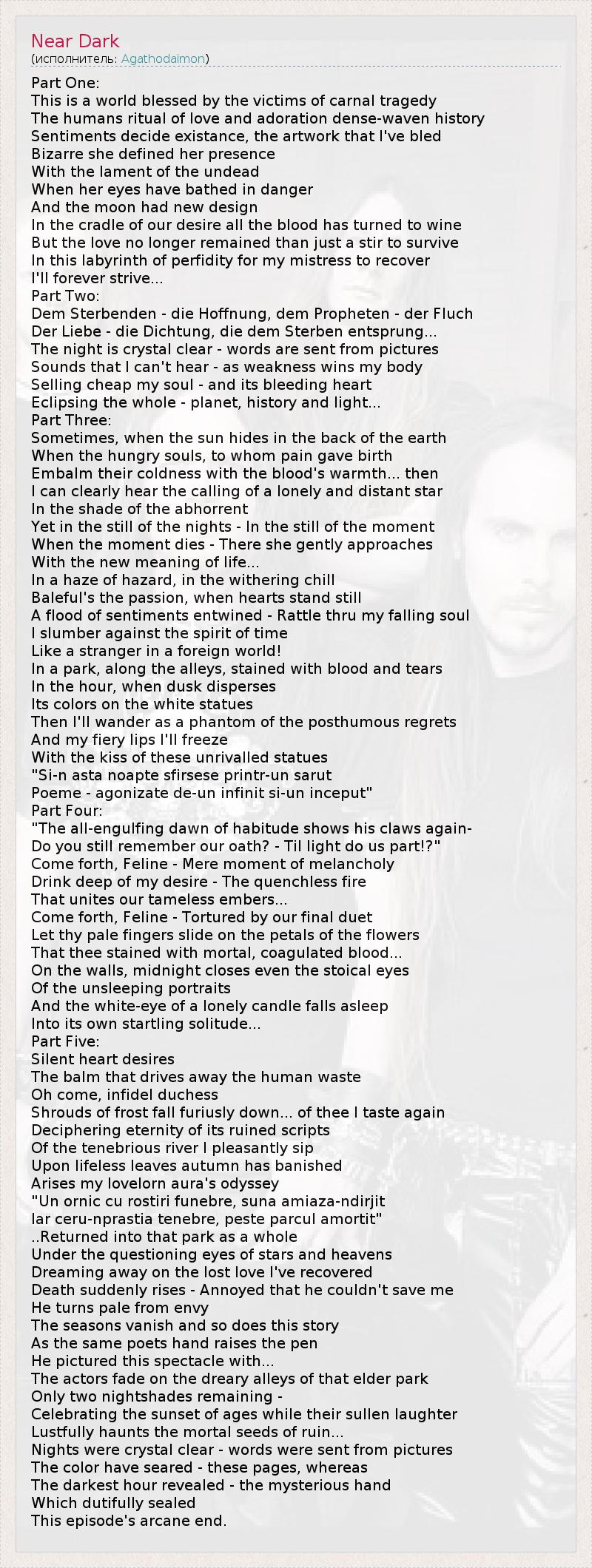 Part One: This is a world blessed by the victims of carnal tragedy The humans ritual of love and adoration dense-waven history Sentiments decide existance, the artwork that I've bled Bizarre she defined her presence With the lament of the undead When her eyes have bathed in danger And the moon had new design In the cradle of our desire all the blood has turned to wine But the love no longer remained than just a stir to survive In this labyrinth of perfidity for my mistress to recover I'll forever strive... Part Two: Dem Sterbenden - die Hoffnung, dem Propheten - der Fluch Der Liebe - die Dichtung, die dem Sterben entsprung... The night is crystal clear - words are sent from pictures Sounds that I can't hear - as weakness wins my body Selling cheap my soul - and its bleeding heart Eclipsing the whole - planet, history and light... Part Three: Sometimes, when the sun hides in the back of the earth When the hungry souls, to whom pain gave birth Embalm their coldness with the blood's warmth... then I can clearly hear the calling of a lonely and distant star In the shade of the abhorrent Yet in the still of the nights - In the still of the moment When the moment dies - There she gently approaches With the new meaning of life... In a haze of hazard, in the withering chill Baleful's the passion, when hearts stand still A flood of sentiments entwined - Rattle thru my falling soul I slumber against the spirit of time Like a stranger in a foreign world! In a park, along the alleys, stained with blood and tears In the hour, when dusk disperses Its colors on the white statues Then I'll wander as a phantom of the posthumous regrets And my fiery lips I'll freeze With the kiss of these unrivalled statues "Si-n asta noapte sfirsese printr-un sarut Poeme - agonizate de-un infinit si-un inceput" Part Four: "The all-engulfing dawn of habitude shows his claws again- Do you still remember our oath? - Til light do us part!?" Come forth, Feline - Mere moment of melancholy Drink deep of my desire - The quenchless fire That unites our tameless embers... Come forth, Feline - Tortured by our final duet Let thy pale fingers slide on the petals of the flowers That thee stained with mortal, coagulated blood... On the walls, midnight closes even the stoical eyes Of the unsleeping portraits And the white-eye of a lonely candle falls asleep Into its own startling solitude... Part Five: Silent heart desires The balm that drives away the human waste Oh come, infidel duchess Shrouds of frost fall furiusly down... of thee I taste again Deciphering eternity of its ruined scripts Of the tenebrious river I pleasantly sip Upon lifeless leaves autumn has banished Arises my lovelorn aura's odyssey "Un ornic cu rostiri funebre, suna amiaza-ndirjit Iar ceru-nprastia tenebre, peste parcul amortit" ..Returned into that park as a whole Under the questioning eyes of stars and heavens Dreaming away on the lost love I've recovered Death suddenly rises - Annoyed that he couldn't save me He turns pale from envy The seasons vanish and so does this story As the same poets hand raises the pen He pictured this spectacle with... The actors fade on the dreary alleys of that elder park Only two nightshades remaining - Celebrating the sunset of ages while their sullen laughter Lustfully haunts the mortal seeds of ruin... Nights were crystal clear - words were sent from pictures The color have seared - these pages, whereas The darkest hour revealed - the mysterious hand Which dutifully sealed This episode's arcane end.