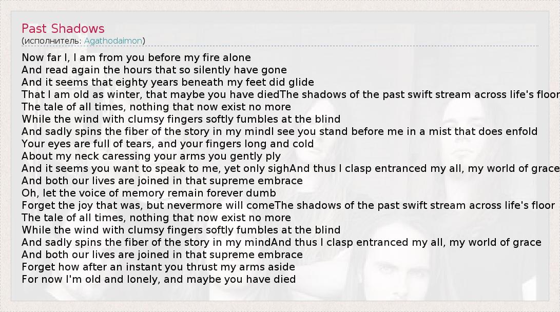 Now far I, I am from you before my fire alone And read again the hours that so silently have gone And it seems that eighty years beneath my feet did glide That I am old as winter, that maybe you have diedThe shadows of the past swift stream across life's floor The tale of all times, nothing that now exist no more While the wind with clumsy fingers softly fumbles at the blind And sadly spins the fiber of the story in my mindI see you stand before me in a mist that does enfold Your eyes are full of tears, and your fingers long and cold About my neck caressing your arms you gently ply And it seems you want to speak to me, yet only sighAnd thus I clasp entranced my all, my world of grace And both our lives are joined in that supreme embrace Oh, let the voice of memory remain forever dumb Forget the joy that was, but nevermore will comeThe shadows of the past swift stream across life's floor The tale of all times, nothing that now exist no more While the wind with clumsy fingers softly fumbles at the blind And sadly spins the fiber of the story in my mindAnd thus I clasp entranced my all, my world of grace And both our lives are joined in that supreme embrace Forget how after an instant you thrust my arms aside For now I'm old and lonely, and maybe you have died