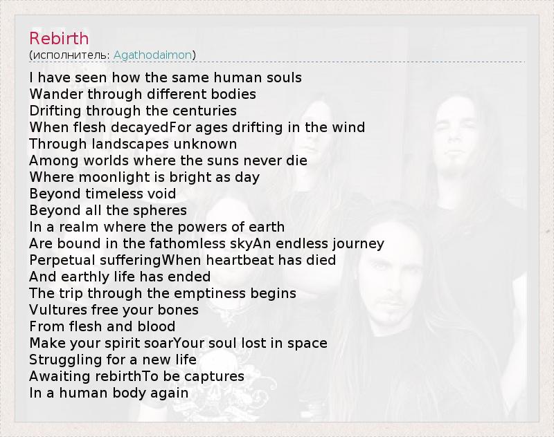I have seen how the same human souls Wander through different bodies Drifting through the centuries When flesh decayedFor ages drifting in the wind Through landscapes unknown Among worlds where the suns never die Where moonlight is bright as day Beyond timeless void Beyond all the spheres In a realm where the powers of earth Are bound in the fathomless skyAn endless journey Perpetual sufferingWhen heartbeat has died And earthly life has ended The trip through the emptiness begins Vultures free your bones From flesh and blood Make your spirit soarYour soul lost in space Struggling for a new life Awaiting rebirthTo be captures In a human body again