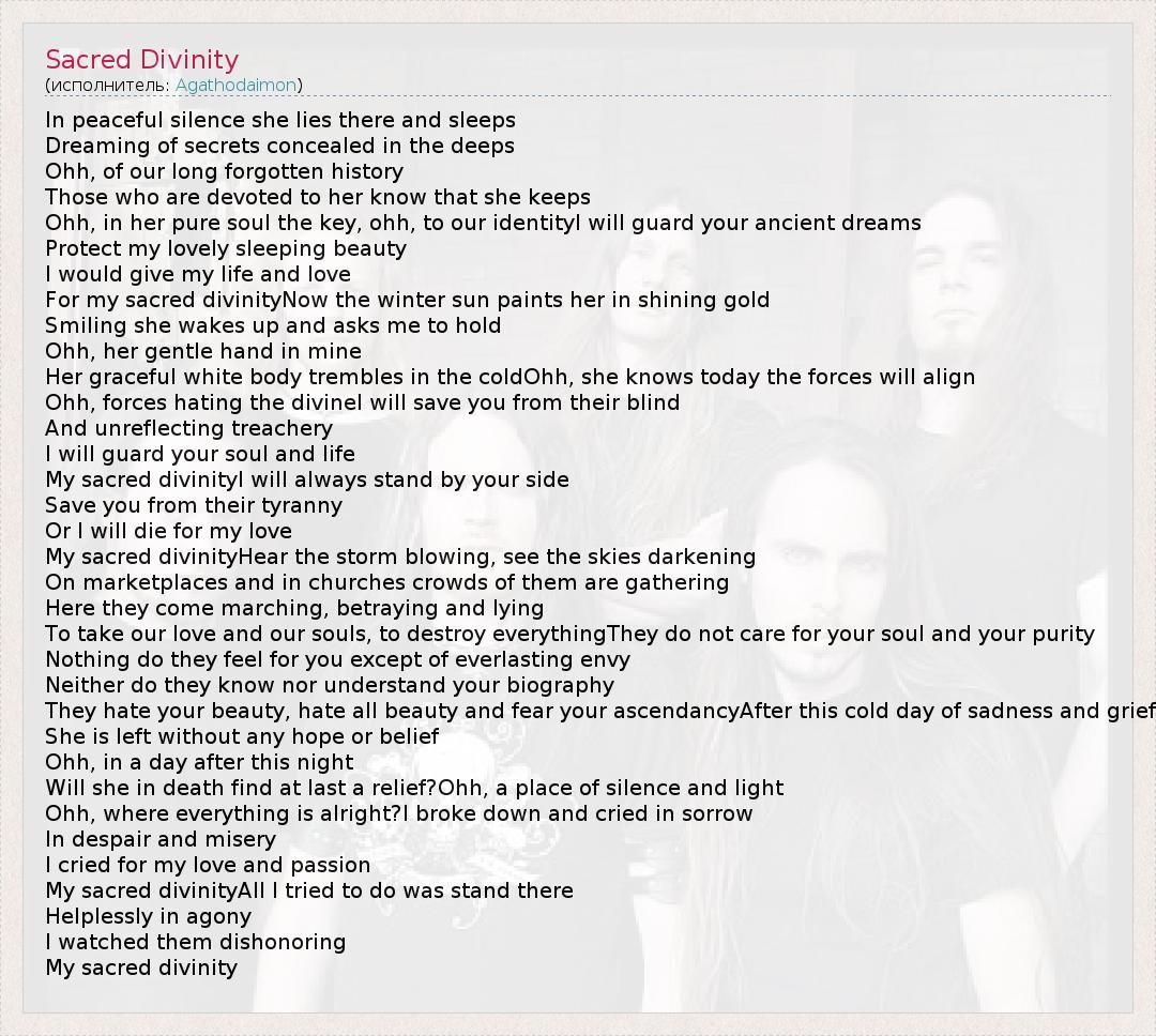 In peaceful silence she lies there and sleeps Dreaming of secrets concealed in the deeps Ohh, of our long forgotten history Those who are devoted to her know that she keeps Ohh, in her pure soul the key, ohh, to our identityI will guard your ancient dreams Protect my lovely sleeping beauty I would give my life and love For my sacred divinityNow the winter sun paints her in shining gold Smiling she wakes up and asks me to hold Ohh, her gentle hand in mine Her graceful white body trembles in the coldOhh, she knows today the forces will align Ohh, forces hating the divineI will save you from their blind And unreflecting treachery I will guard your soul and life My sacred divinityI will always stand by your side Save you from their tyranny Or I will die for my love My sacred divinityHear the storm blowing, see the skies darkening On marketplaces and in churches crowds of them are gathering Here they come marching, betraying and lying To take our love and our souls, to destroy everythingThey do not care for your soul and your purity Nothing do they feel for you except of everlasting envy Neither do they know nor understand your biography They hate your beauty, hate all beauty and fear your ascendancyAfter this cold day of sadness and grief She is left without any hope or belief Ohh, in a day after this night Will she in death find at last a relief?Ohh, a place of silence and light Ohh, where everything is alright?I broke down and cried in sorrow In despair and misery I cried for my love and passion My sacred divinityAll I tried to do was stand there Helplessly in agony I watched them dishonoring My sacred divinity