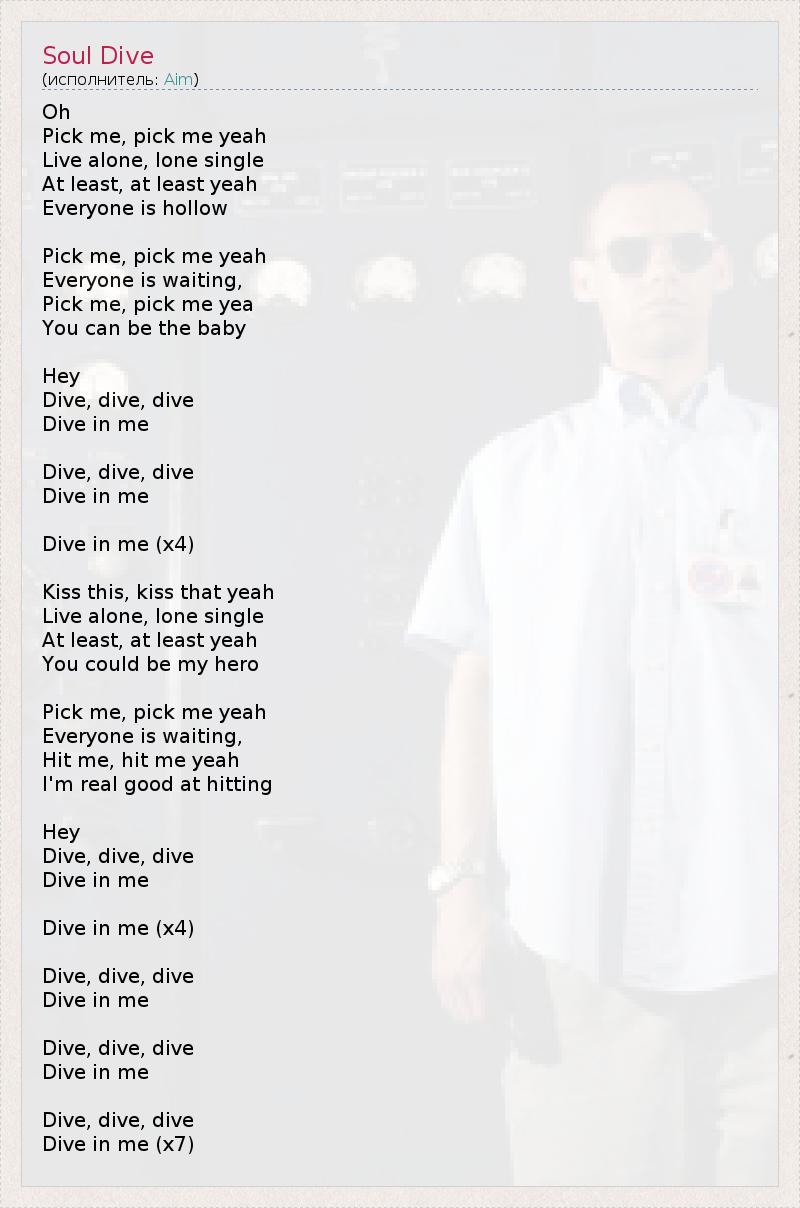Oh Pick me, pick me yeah Live alone, lone single At least, at least yeah Everyone is hollow Pick me, pick me yeah Everyone is waiting, Pick me, pick me yea You can be the baby Hey Dive, dive, dive Dive in me Dive, dive, dive Dive in me Dive in me (х4) Kiss this, kiss that yeah Live alone, lone single At least, at least yeah You could be my hero Pick me, pick me yeah Everyone is waiting, Hit me, hit me yeah I'm real good at hitting Hey Dive, dive, dive Dive in me Dive in me (х4) Dive, dive, dive Dive in me Dive, dive, dive Dive in me Dive, dive, dive Dive in me (х7)