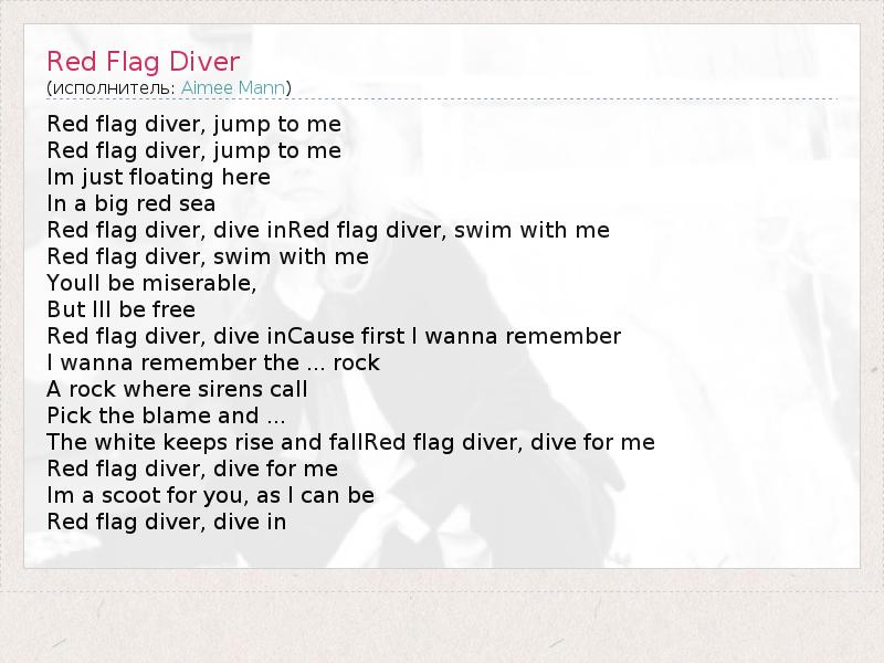 Red flag diver, jump to me Red flag diver, jump to me Im just floating here In a big red sea Red flag diver, dive inRed flag diver, swim with me Red flag diver, swim with me Youll be miserable, But Ill be free Red flag diver, dive inCause first I wanna remember I wanna remember the ... rock A rock where sirens call Pick the blame and ... The white keeps rise and fallRed flag diver, dive for me Red flag diver, dive for me Im a scoot for you, as I can be Red flag diver, dive in