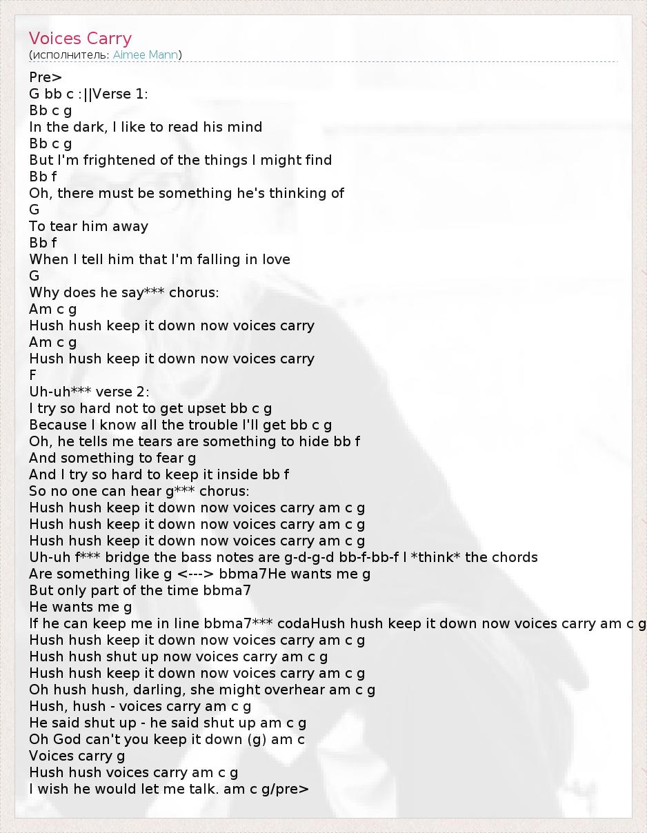 Pre> G bb c :||Verse 1: Bb c g In the dark, I like to read his mind Bb c g But I'm frightened of the things I might find Bb f Oh, there must be something he's thinking of G To tear him away Bb f When I tell him that I'm falling in love G Why does he say*** chorus: Am c g Hush hush keep it down now voices carry Am c g Hush hush keep it down now voices carry F Uh-uh*** verse 2: I try so hard not to get upset bb c g Because I know all the trouble I'll get bb c g Oh, he tells me tears are something to hide bb f And something to fear g And I try so hard to keep it inside bb f So no one can hear g*** chorus: Hush hush keep it down now voices carry am c g Hush hush keep it down now voices carry am c g Hush hush keep it down now voices carry am c g Uh-uh f*** bridge the bass notes are g-d-g-d bb-f-bb-f I *think* the chords Are something like g <---> bbma7He wants me g But only part of the time bbma7 He wants me g If he can keep me in line bbma7*** codaHush hush keep it down now voices carry am c g Hush hush keep it down now voices carry am c g Hush hush shut up now voices carry am c g Hush hush keep it down now voices carry am c g Oh hush hush, darling, she might overhear am c g Hush, hush - voices carry am c g He said shut up - he said shut up am c g Oh God can't you keep it down (g) am c Voices carry g Hush hush voices carry am c g I wish he would let me talk. am c g/pre>
