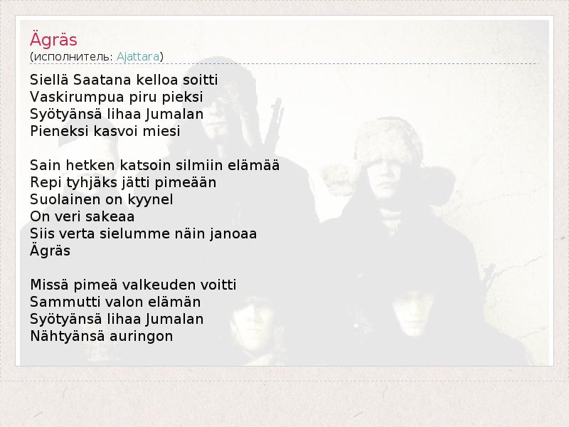 Это интересно:Ajattara (Aiatar, Ajattaro, Ajattar) — финское божество, злой лесной дух, бог потерянных, тех, кто заблудился в лесу. Когда человек теряется в лесу, он попадает во власть Ajattara, которая принимает образ красивой женщины. История Ajattara берет свое начало в 1996 году, когда фронтмен культовой финской группы Amorphis Паси Коскинен начал забавы ради писать песни в стиле dark metal. Ajattara отдали предпочтение родному финскому... продолжение