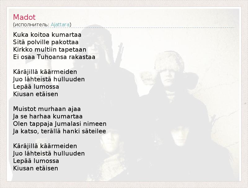 Это интересно:Ajattara (Aiatar, Ajattaro, Ajattar) — финское божество, злой лесной дух, бог потерянных, тех, кто заблудился в лесу. Когда человек теряется в лесу, он попадает во власть Ajattara, которая принимает образ красивой женщины. История Ajattara берет свое начало в 1996 году, когда фронтмен культовой финской группы Amorphis Паси Коскинен начал забавы ради писать песни в стиле dark metal. Ajattara отдали предпочтение родному финскому... продолжение