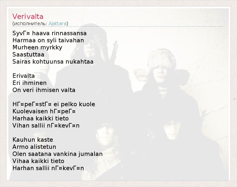 Syvä haava rinnassansa Harmaa on syli taivahan Murheen myrkky Saastuttaa Sairas kohtuunsa nukahtaa Erivalta Eri ihminen On veri ihmisen valta Häpeästä ei pelko kuole Kuolevaisen häpeä Harhaa kaikki tieto Vihan sallii näkevän Kauhun kaste Armo alistetun Olen saatana vankina jumalan Vihaa kaikki tieto Harhan sallii näkevän