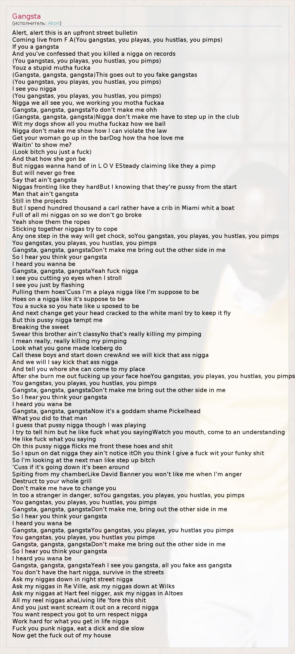 Alert, alert this is an upfront street bulletin Coming live from F A(You gangstas, you playas, you hustlas, you pimps) If you a gangsta And you've confessed that you killed a nigga on records (You gangstas, you playas, you hustlas, you pimps) Youz a stupid mutha fucka (Gangsta, gangsta, gangsta)This goes out to you fake gangstas (You gangstas, you playas, you hustlas, you pimps) I see you nigga (You gangstas, you playas, you hustlas, you pimps) Nigga we all see you, we working you motha fuckaa Gangsta, gangsta, gangstaYo don't make me ohh (Gangsta, gangsta, gangsta)Nigga don't make me have to step up in the club Wit my dogs show all you mutha fuckaz how we ball Nigga don't make me show how I can violate the law Get your woman go up in the barDog how tha hoe love me Waitin' to show me? (Look bitch you just a fuck) And that how she gon be But niggas wanna hand of in L O V ESteady claiming like they a pimp But will never go free Say that ain't gangsta Niggas fronting like they hardBut I knowing that they're pussy from the start Man that ain't gangsta Still in the projects But I spend hundred thousand a carI rather have a crib in Miami whit a boat Full of all mi niggas on so we don't go broke Yeah show them the ropes Sticking together niggas try to cope Any one step in the way will get chock, soYou gangstas, you playas, you hustlas, you pimps You gangstas, you playas, you hustlas, you pimps Gangsta, gangsta, gangstaDon't make me bring out the other side in me So I hear you think your gangsta I heard you wanna be Gangsta, gangsta, gangstaYeah fuck nigga I see you cutting yo eyes when I stroll I see you just by flashing Pulling them hoes'Cuss I'm a playa nigga like I'm suppose to be Hoes on a nigga like it's suppose to be You a sucka so you hate like u sposed to be And next change get your head cracked to the white manI try to keep it fly But this pussy nigga tempt me Breaking the sweet Swear this brother ain't classyNo that's really killing my pimping I mean really, really killing my pimping Look what you gone made Iceberg do Call these boys and start down crewAnd we will kick that ass nigga And we will I say kick that ass nigga And tell you whore she can come to my place After she burn me out fucking up your face hoeYou gangstas, you playas, you hustlas, you pimps You gangstas, you playas, you hustlas, you pimps Gangsta, gangsta, gangstaDon't make me bring out the other side in me So I hear you think your gangsta I heard you wana be Gangsta, gangsta, gangstaNow it's a goddam shame Pickelhead What you did to that man I guess that pussy nigga though I was playing I try to tell him but he like fuck what you sayingWatch you mouth, come to an understanding He like fuck what you saying Oh this pussy nigga flicks me front these hoes and shit So I spun on dat nigga they ain't notice itOh you think I give a fuck wit your funky shit So I'm looking at the next man like step up bitch 'Cuss if it's going down it's been around Spiting from my chamberLike David Banner you won't like me when I'm anger Destruct to your whole grill Don't make me have to change you In too a stranger in danger, soYou gangstas, you playas, you hustlas, you pimps You gangstas, you playas, you hustlas, you pimps Gangsta, gangsta, gangstaDon't make me, bring out the other side in me So I hear you think your gangsta I heard you wana be Gangsta, gangsta, gangstaYou gangstas, you playas, you hustlas you pimps You gangstas, you playas, you hustlas you pimps Gangsta, gangsta, gangstaDon't make me bring out the other side in me So I hear you think your gangsta I heard you wana be Gangsta, gangsta, gangstaYeah I see you gangsta, all you fake ass gangsta You don't have the hart nigga, survive in the streets Ask my niggas down in right street nigga Ask my niggas in Re Ville, ask my niggas down at Wilks Ask my niggas at Hart feel nigger, ask my niggas in Altoes All my reel niggas ahaLiving life 'fore this shit And you just want scream it out on a record nigga You want respect you got to urn respect nigga Work hard for what you get in life nigga Fuck you punk nigga, eat a dick and die slow Now get the fuck out of my house