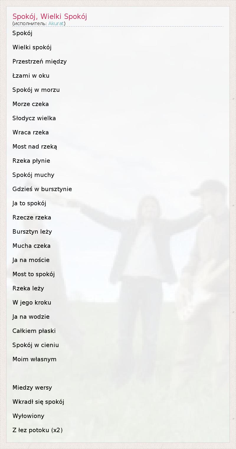 Spokój Wielki spokój Przestrzeń między Łzami w oku Spokój w morzu Morze czeka Słodycz wielka Wraca rzeka Most nad rzeką Rzeka płynie Spokój muchy Gdzieś w bursztynie Ja to spokój Rzecze rzeka Bursztyn leży Mucha czeka Ja na moście Most to spokój Rzeka leży W jego kroku Ja na wodzie Całkiem płaski Spokój w cieniu Moim własnym Miedzy wersy Wkradł się spokój Wyłowiony Z łez potoku (x2)