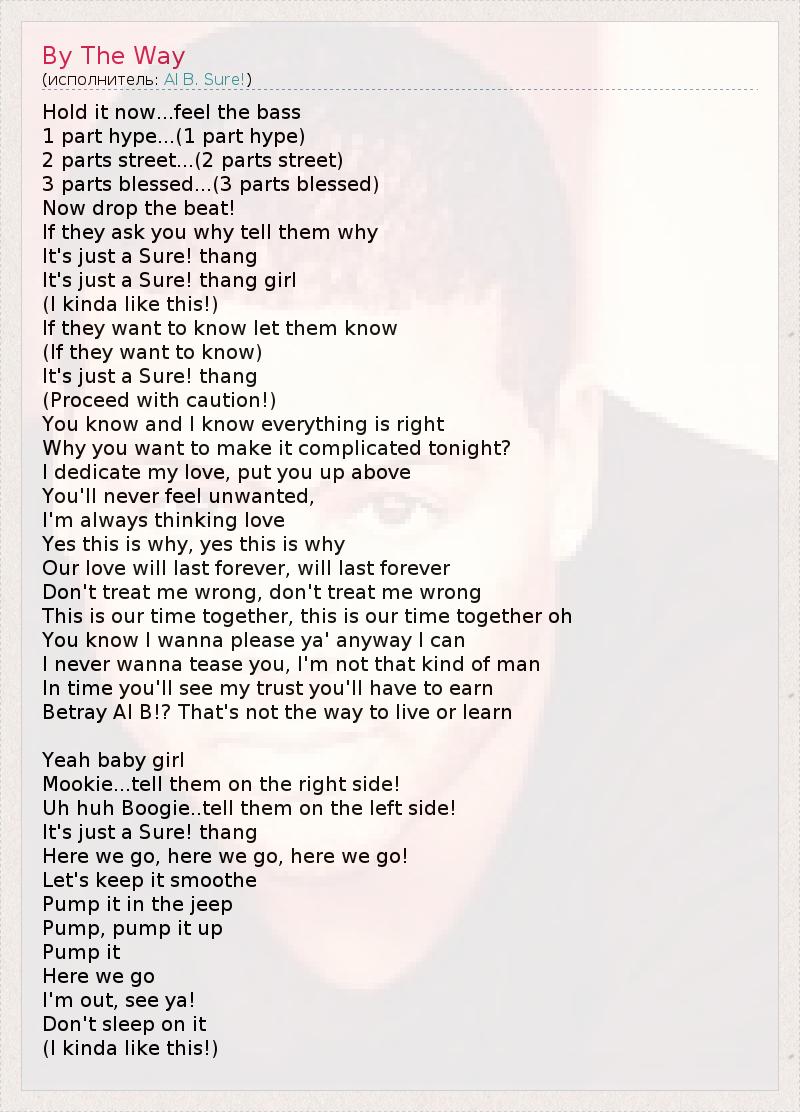 Hold it now...feel the bass 1 part hype...(1 part hype) 2 parts street...(2 parts street) 3 parts blessed...(3 parts blessed) Now drop the beat! If they ask you why tell them why It's just a Sure! thang It's just a Sure! thang girl (I kinda like this!) If they want to know let them know (If they want to know) It's just a Sure! thang (Proceed with caution!) You know and I know everything is right Why you want to make it complicated tonight? I dedicate my love, put you up above You'll never feel unwanted, I'm always thinking love Yes this is why, yes this is why Our love will last forever, will last forever Don't treat me wrong, don't treat me wrong This is our time together, this is our time together oh You know I wanna please ya' anyway I can I never wanna tease you, I'm not that kind of man In time you'll see my trust you'll have to earn Betray Al B!? That's not the way to live or learn Yeah baby girl Mookie...tell them on the right side! Uh huh Boogie..tell them on the left side! It's just a Sure! thang Here we go, here we go, here we go! Let's keep it smoothe Pump it in the jeep Pump, pump it up Pump it Here we go I'm out, see ya! Don't sleep on it (I kinda like this!)