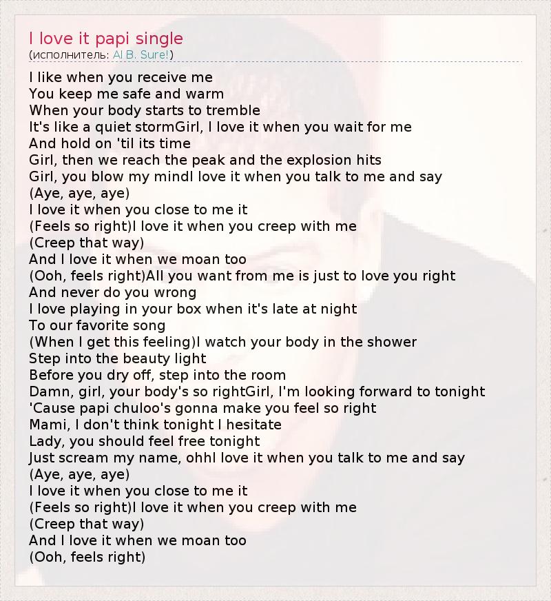 I like when you receive me You keep me safe and warm When your body starts to tremble It's like a quiet stormGirl, I love it when you wait for me And hold on 'til its time Girl, then we reach the peak and the explosion hits Girl, you blow my mindI love it when you talk to me and say (Aye, aye, aye) I love it when you close to me it (Feels so right)I love it when you creep with me (Creep that way) And I love it when we moan too (Ooh, feels right)All you want from me is just to love you right And never do you wrong I love playing in your box when it's late at night To our favorite song (When I get this feeling)I watch your body in the shower Step into the beauty light Before you dry off, step into the room Damn, girl, your body's so rightGirl, I'm looking forward to tonight 'Cause papi chuloo's gonna make you feel so right Mami, I don't think tonight I hesitate Lady, you should feel free tonight Just scream my name, ohhI love it when you talk to me and say (Aye, aye, aye) I love it when you close to me it (Feels so right)I love it when you creep with me (Creep that way) And I love it when we moan too (Ooh, feels right)