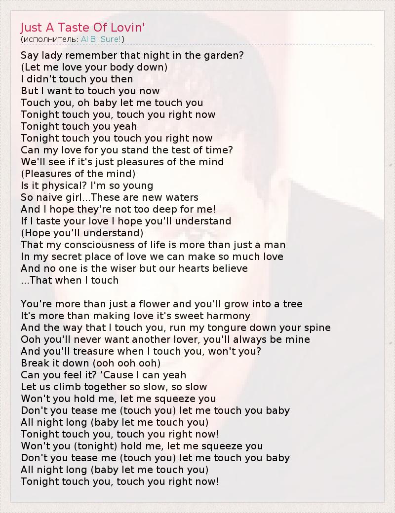 Say lady remember that night in the garden? (Let me love your body down) I didn't touch you then But I want to touch you now Touch you, oh baby let me touch you Tonight touch you, touch you right now Tonight touch you yeah Tonight touch you touch you right now Can my love for you stand the test of time? We'll see if it's just pleasures of the mind (Pleasures of the mind) Is it physical? I'm so young So naive girl...These are new waters And I hope they're not too deep for me! If I taste your love I hope you'll understand (Hope you'll understand) That my consciousness of life is more than just a man In my secret place of love we can make so much love And no one is the wiser but our hearts believe ...That when I touch You're more than just a flower and you'll grow into a tree It's more than making love it's sweet harmony And the way that I touch you, run my tongure down your spine Ooh you'll never want another lover, you'll always be mine And you'll treasure when I touch you, won't you? Break it down (ooh ooh ooh) Can you feel it? 'Cause I can yeah Let us climb together so slow, so slow Won't you hold me, let me squeeze you Don't you tease me (touch you) let me touch you baby All night long (baby let me touch you) Tonight touch you, touch you right now! Won't you (tonight) hold me, let me squeeze you Don't you tease me (touch you) let me touch you baby All night long (baby let me touch you) Tonight touch you, touch you right now!