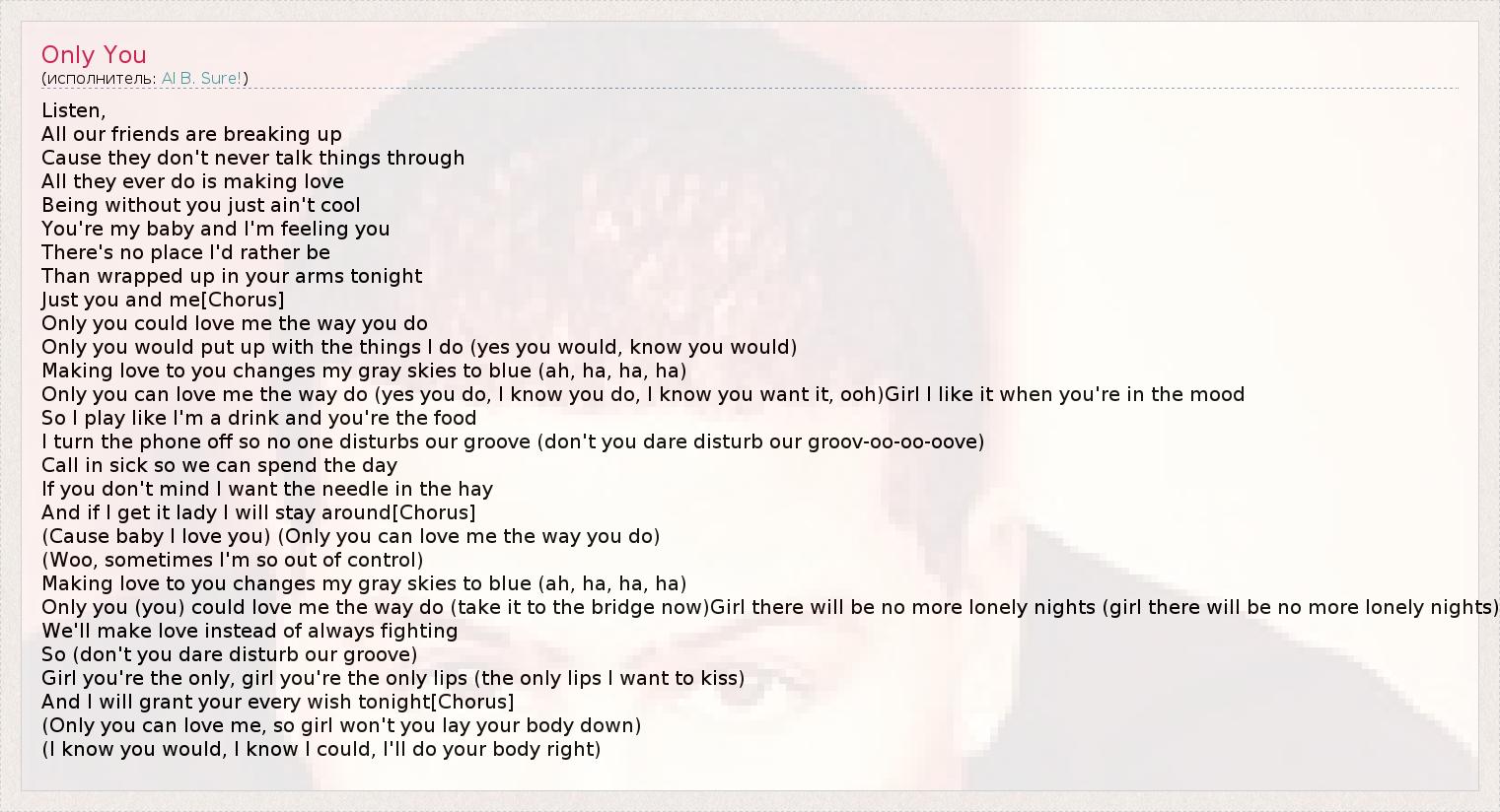 Listen, All our friends are breaking up Cause they don't never talk things through All they ever do is making love Being without you just ain't cool You're my baby and I'm feeling you There's no place I'd rather be Than wrapped up in your arms tonight Just you and me[Chorus] Only you could love me the way you do Only you would put up with the things I do (yes you would, know you would) Making love to you changes my gray skies to blue (ah, ha, ha, ha) Only you can love me the way do (yes you do, I know you do, I know you want it, ooh)Girl I like it when you're in the mood So I play like I'm a drink and you're the food I turn the phone off so no one disturbs our groove (don't you dare disturb our groov-oo-oo-oove) Call in sick so we can spend the day If you don't mind I want the needle in the hay And if I get it lady I will stay around[Chorus] (Cause baby I love you) (Only you can love me the way you do) (Woo, sometimes I'm so out of control) Making love to you changes my gray skies to blue (ah, ha, ha, ha) Only you (you) could love me the way do (take it to the bridge now)Girl there will be no more lonely nights (girl there will be no more lonely nights) We'll make love instead of always fighting So (don't you dare disturb our groove) Girl you're the only, girl you're the only lips (the only lips I want to kiss) And I will grant your every wish tonight[Chorus] (Only you can love me, so girl won't you lay your body down) (I know you would, I know I could, I'll do your body right)