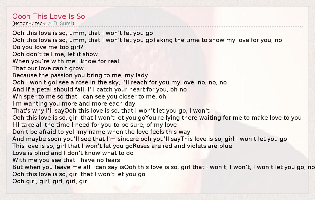 Ooh this love is so, umm, that I won't let you go Ooh this love is so, umm, that I won't let you goTaking the time to show my love for you, no Do you love me too girl? Ooh don't tell me, let it show When you're with me I know for real That our love can't grow Because the passion you bring to me, my lady Ooh I won't goI see a rose in the sky, I'll reach for you my love, no, no, no And if a petal should fall, I'll catch your heart for you, oh no Whisper to me so that I can see you closer to me, oh I'm wanting you more and more each day That's why I'll sayOoh this love is so, that I won't let you go, I won't Ooh this love is so, girl that I won't let you goYou're lying there waiting for me to make love to you I'll take all the time I need for you to be sure, of my love Don't be afraid to yell my name when the love feels this way And maybe soon you'll see that I'm sincere ooh you'll sayThis love is so, girl I won't let you go This love is so, girl that I won't let you goRoses are red and violets are blue Love is blind and I don't know what to do With me you see that I have no fears But when you leave me all I can say isOoh this love is so, girl that I won't, I won't, I won't let you go, no Ooh this love is so, girl that I won't let you go Ooh girl, girl, girl, girl, girl