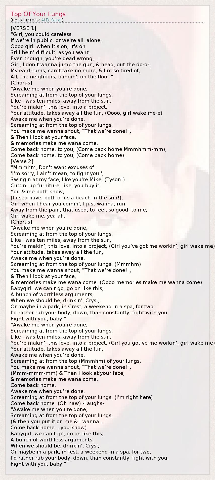 [VERSE 1] "Girl, you could careless, If we're in public, or we're all, alone, Oooo girl, when it's on, it's on, Still bein' difficult, as you want, Even though, you're dead wrong, Girl, I don't wanna jump the gun, & head, out the do-or, My eard-rums, can't take no more, & I'm so tired of, All, the neighbors, bangin', on the floor." [Chorus] "Awake me when you're done, Screaming at from the top of your lungs, Like I was ten miles, away from the sun, You're makin', this love, into a project, Your attitude, takes away all the fun, (Oooo, girl wake me-e) Awake me when you're done, Screaming at from the top of your lungs, You make me wanna shout, "That we're done!", & Then I look at your face, & memories make me wana come, Come back home, to you, (Come back home Mmmhmm-mm), Come back home, to you, (Come back home). [Verse 2] "Mmmhm, Don't want excuses of: 'I'm sorry, I ain't mean, to fight you.', Swingin at my face, like you're Mike, (Tyson!) Cuttin' up furniture, like, you buy it, You & me both know, (I used have, both of us a beach in the sun!), Girl when I hear you comin', I just wanna, run, Away from the pain, that used, to feel, so good, to me, Girl wake me, yea-ah." [Chorus] "Awake me when you're done, Screaming at from the top of your lungs, Like I was ten miles, away from the sun, You're makin', this love, into a project, (Girl you've got me workin', girl wake me) Your attitude, takes away all the fun, Awake me when you're done, Screaming at from the top of your lungs, (Mmmhm) You make me wanna shout, "That we're done!", & Then I look at your face, & memories make me wana come, (Oooo memories make me wanna come) Babygirl, we can't go, go on like this, A bunch of worthless arguments, When we should be, drinkin', Crys', Or maybe in a park, in Crest, a weekend in a spa, for two, I'd rather rub your body, down, than constantly, fight with you. Fight with you, baby." "Awake me when you're done, Screaming at from the top of your lungs, Like I was ten miles, away from the sun, You're makin', this love, into a project, (Girl you got've me workin', girl wake me) Your attitude, takes away all the fun, Awake me when you're done, Screaming at from the top (Mmmhm) of your lungs, You make me wanna shout, "That we're done!", (Mmm-mmm-mm) & Then I look at your face, & memories make me wana come, Come back home. Awake me when you're done, Screaming at from the top of your lungs, (I'm right here) Come back home. (Oh naw) -Laughs- "Awake me when you're done, Screaming at from the top of your lungs, (& then you put it on me & I wanna .. Come back home .. you know) Babygirl, we can't go, go on like this, A bunch of worthless arguments, When we should be, drinkin', Crys', Or maybe in a park, in fest, a weekend in a spa, for two, I'd rather rub your body, down, than constantly, fight with you. Fight with you, baby."