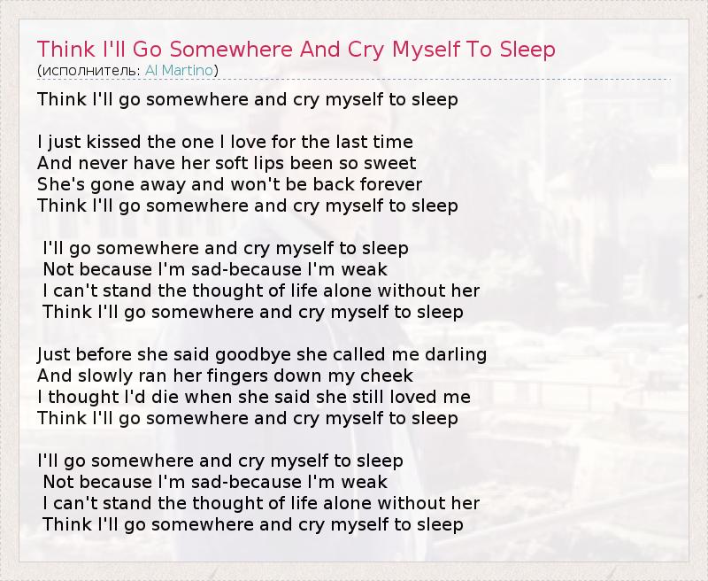 Think I'll go somewhere and cry myself to sleep I just kissed the one I love for the last time And never have her soft lips been so sweet She's gone away and won't be back forever Think I'll go somewhere and cry myself to sleep I'll go somewhere and cry myself to sleep Not because I'm sad-because I'm weak I can't stand the thought of life alone without her Think I'll go somewhere and cry myself to sleep Just before she said goodbye she called me darling And slowly ran her fingers down my cheek I thought I'd die when she said she still loved me Think I'll go somewhere and cry myself to sleep I'll go somewhere and cry myself to sleep Not because I'm sad-because I'm weak I can't stand the thought of life alone without her Think I'll go somewhere and cry myself to sleep