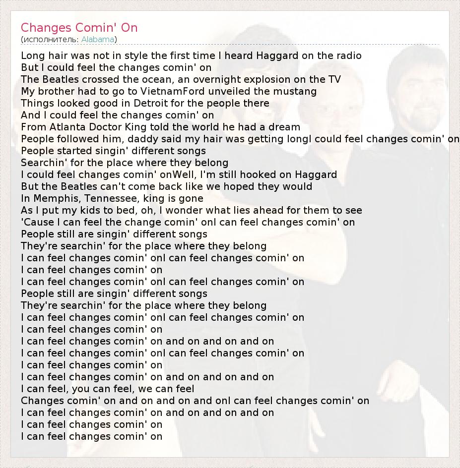 Long hair was not in style the first time I heard Haggard on the radio But I could feel the changes comin' on The Beatles crossed the ocean, an overnight explosion on the TV My brother had to go to VietnamFord unveiled the mustang Things looked good in Detroit for the people there And I could feel the changes comin' on From Atlanta Doctor King told the world he had a dream People followed him, daddy said my hair was getting longI could feel changes comin' on People started singin' different songs Searchin' for the place where they belong I could feel changes comin' onWell, I'm still hooked on Haggard But the Beatles can't come back like we hoped they would In Memphis, Tennessee, king is gone As I put my kids to bed, oh, I wonder what lies ahead for them to see 'Cause I can feel the change comin' onI can feel changes comin' on People still are singin' different songs They're searchin' for the place where they belong I can feel changes comin' onI can feel changes comin' on I can feel changes comin' on I can feel changes comin' onI can feel changes comin' on People still are singin' different songs They're searchin' for the place where they belong I can feel changes comin' onI can feel changes comin' on I can feel changes comin' on I can feel changes comin' on and on and on and on I can feel changes comin' onI can feel changes comin' on I can feel changes comin' on I can feel changes comin' on and on and on and on I can feel, you can feel, we can feel Changes comin' on and on and on and onI can feel changes comin' on I can feel changes comin' on and on and on and on I can feel changes comin' on I can feel changes comin' on