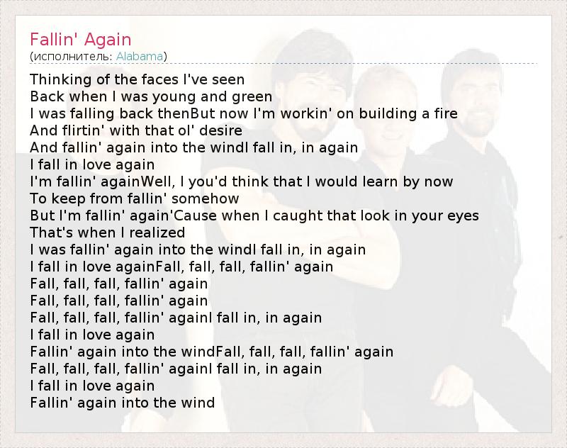 Thinking of the faces I've seen Back when I was young and green I was falling back thenBut now I'm workin' on building a fire And flirtin' with that ol' desire And fallin' again into the windI fall in, in again I fall in love again I'm fallin' againWell, l you'd think that I would learn by now To keep from fallin' somehow But I'm fallin' again'Cause when I caught that look in your eyes That's when I realized I was fallin' again into the windI fall in, in again I fall in love againFall, fall, fall, fallin' again Fall, fall, fall, fallin' again Fall, fall, fall, fallin' again Fall, fall, fall, fallin' againI fall in, in again I fall in love again Fallin' again into the windFall, fall, fall, fallin' again Fall, fall, fall, fallin' againI fall in, in again I fall in love again Fallin' again into the wind