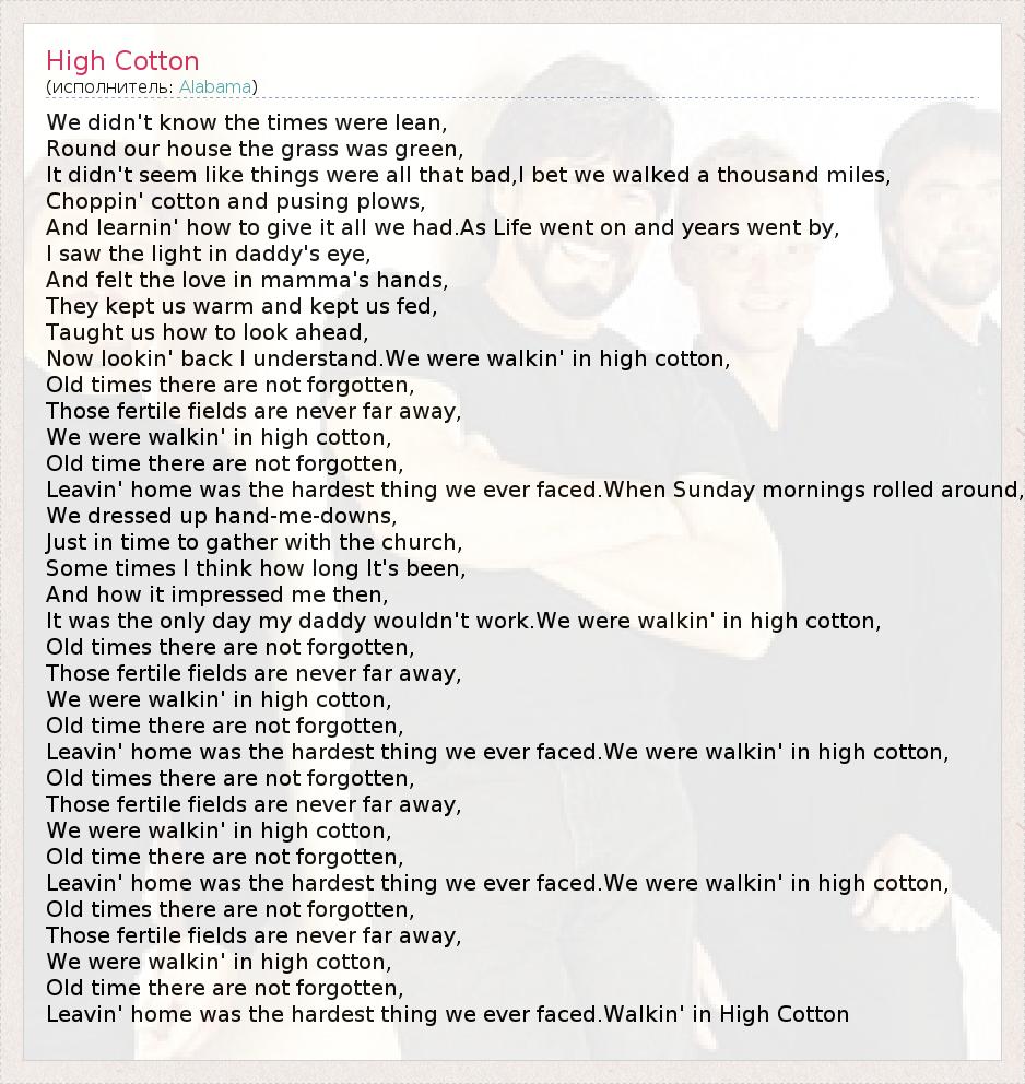 Leavin' home was the hardest thing we ever faced.Walkin' in High Cotton