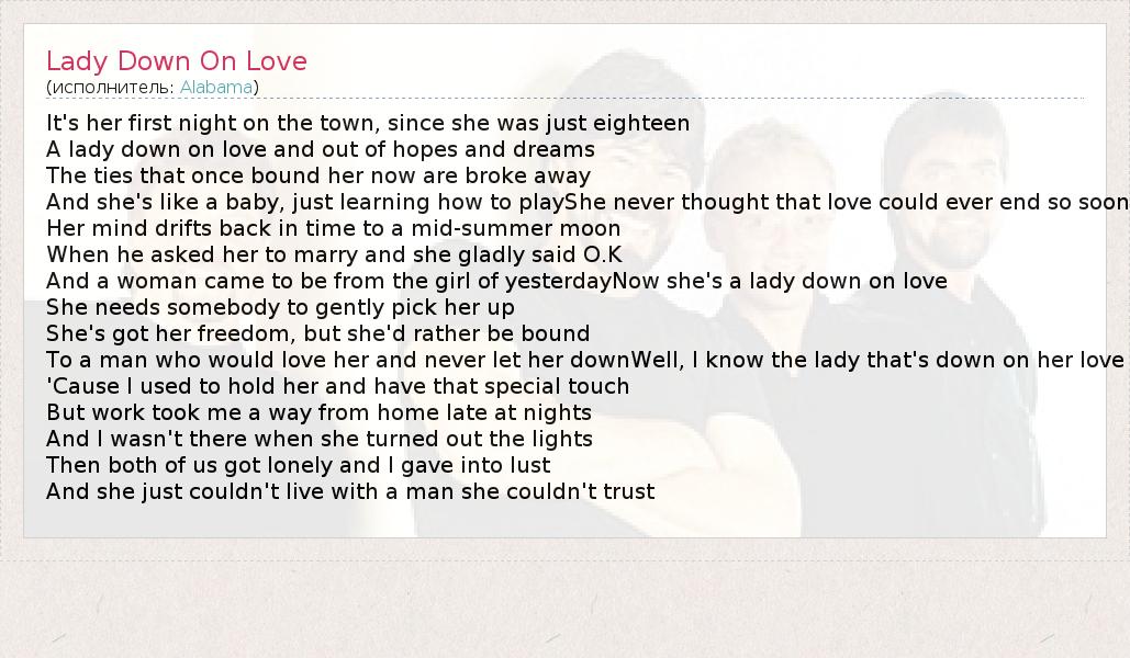А как ты думаешь, о чем песня "Lady Down On Love" ?