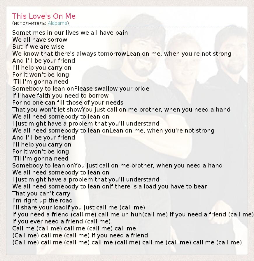 Sometimes in our lives we all have pain We all have sorrow But if we are wise We know that there's always tomorrowLean on me, when you're not strong And I'll be your friend I'll help you carry on For it won't be long 'Til I'm gonna need Somebody to lean onPlease swallow your pride If I have faith you need to borrow For no one can fill those of your needs That you won't let showYou just call on me brother, when you need a hand We all need somebody to lean on I just might have a problem that you'll understand We all need somebody to lean onLean on me, when you're not strong And I'll be your friend I'll help you carry on For it won't be long 'Til I'm gonna need Somebody to lean onYou just call on me brother, when you need a hand We all need somebody to lean on I just might have a problem that you'll understand We all need somebody to lean onIf there is a load you have to bear That you can't carry I'm right up the road I'll share your loadIf you just call me (call me) If you need a friend (call me) call me uh huh(call me) if you need a friend (call me) If you ever need a friend (call me) Call me (call me) call me (call me) call me (Call me) call me (call me) if you need a friend (Call me) call me (call me) call me (call me) call me (call me) call me (call me)