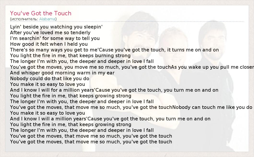 А как ты думаешь, о чем песня "You've Got the Touch" ?