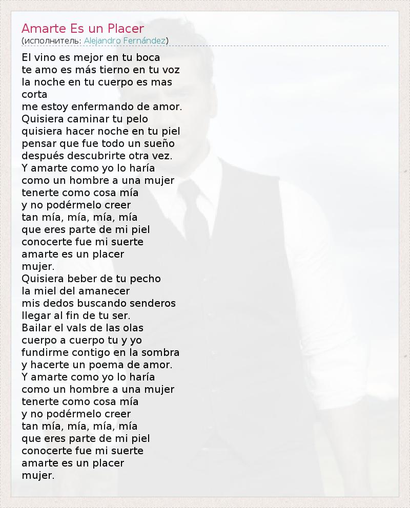El Vino эс Mejor ан ту Бока Te Amo эс más Tierno ан ту VOZ ла Noche ан Вт Cuerpo эс Рождество Corta мне Estoy enfermando De Amor . Quisiera Caminar ту Pelo quisiera Hacer Noche ан ту Piel pensar дие ФРУ TODO ООН sueño después descubrirte Otra Vez . У Amarte Комо лет вот Haría Комо ООН HOMBRE в Una Mujer tenerte Комо Cosa Mía у нет podérmelo Creer загар Mía , МВД , МВД , МВД дие ERES одностороннем порядке де миль Piel conocerte ФРУ миль Suerte Amarte эс ООН россыпь Mujer . Quisiera Beber де ту Pecho ла Миэль -дель- Amanecer MIS DeDos Buscando Сендерос llegar др. плавник де ту сер . Bailar эль вальс де Лас Олас CuerpoCuerpo ту у лет fundirme Contigo ан La Sombra у hacerte ип поэма De Amor . У Amarte Комо лет вот Haría Комо ООН HOMBRE в Una Mujer tenerte Комо Cosa Mía у нет podérmelo Creer загар Mía , МВД , МВД , МВД дие ERES одностороннем порядке де миль Piel conocerte ФРУ миль Suerte Amarte эс ООН россыпь Mujer .